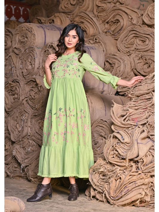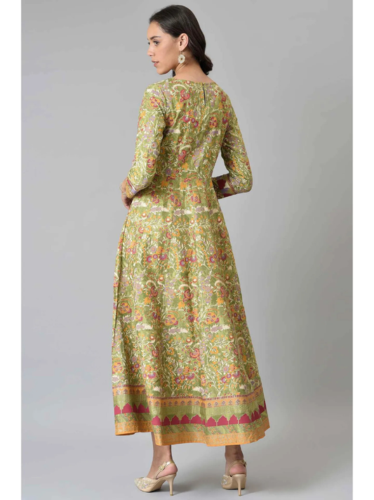 Cotton Linen Olive Front Open Pleated Hem Dress