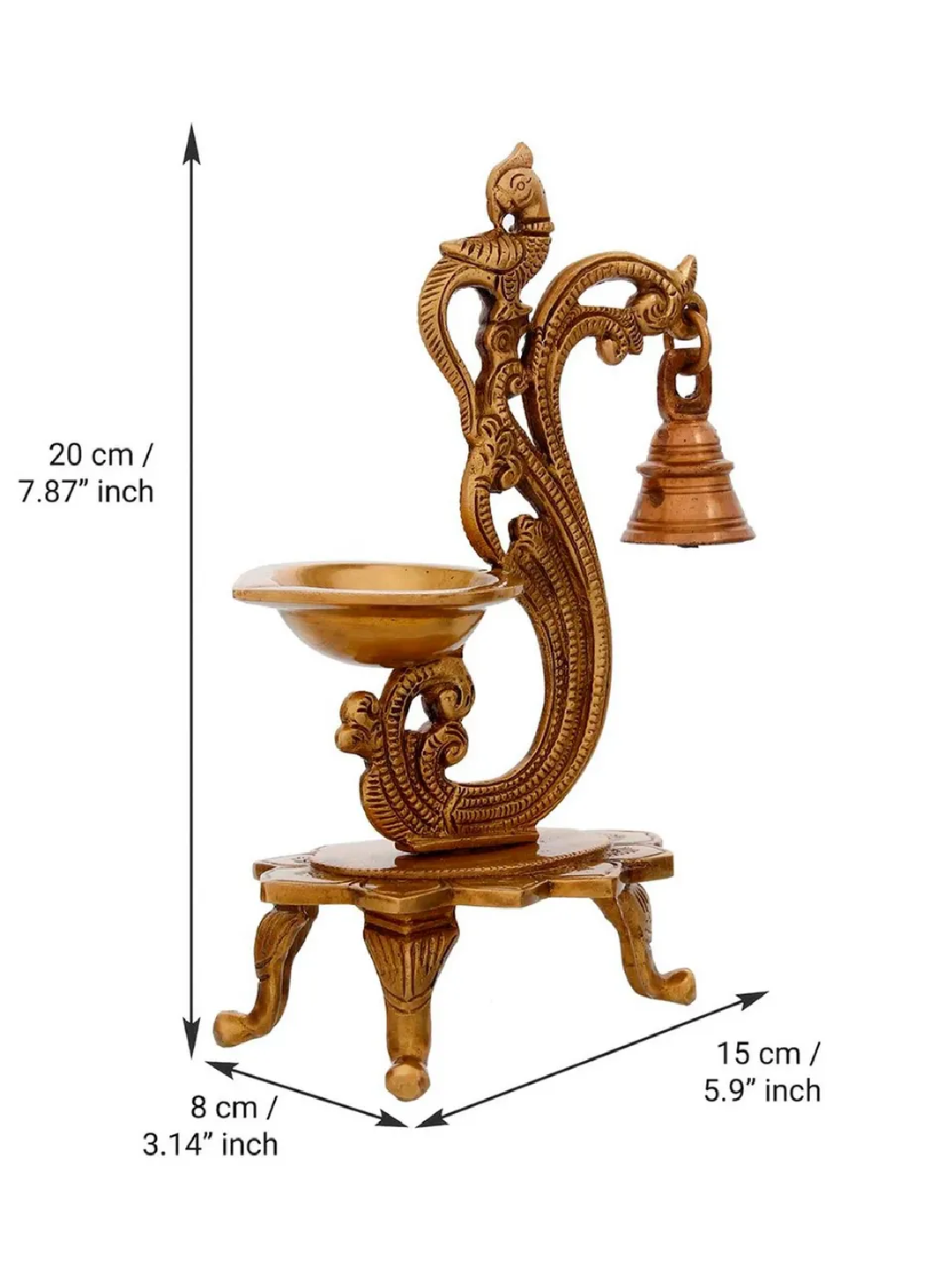 Lend a hint of decoration to your home with this antique finish decorative handcrafted brass parrot showpiece Diya with bells and stand. Exquisitely designed, this Diya has a unique antique look. This gorgeous and exquisite figure is perfect for your home. It is made of brass in an antique finish. It's a wonderful keepsake for your home and unique as gifts for your loved ones. This designer Deepak or Diya isn't just a Diya, it's a multipurpose decorative embellishment for all modern homes. The Diya is bright and beautiful for any temple or home and has been handcrafted by Navaani using modern and traditional techniques.