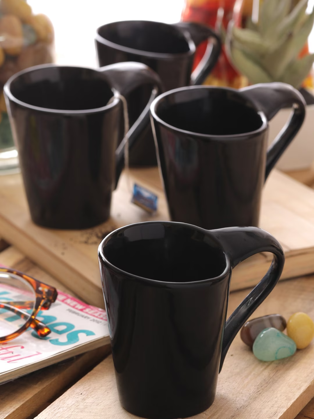 - A handcrafted collection with classy cuts and modern designs makes VarEesha's bouquet of drinkware a unique one. Stylish mugs are a great way to add oomph to your daily lifestyle. The glossy black contemporary designed mugs make an eye catching option for your kitchen. These Black Coffee Mugs Set of Six from VarEesha will enhance your crockery collection.