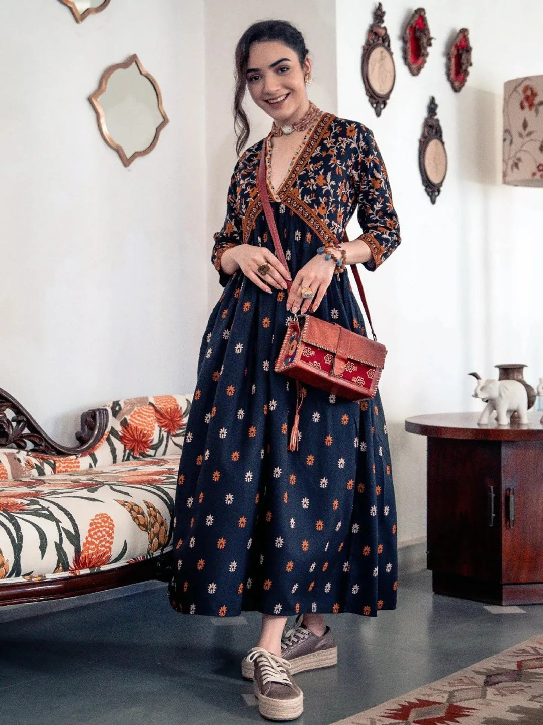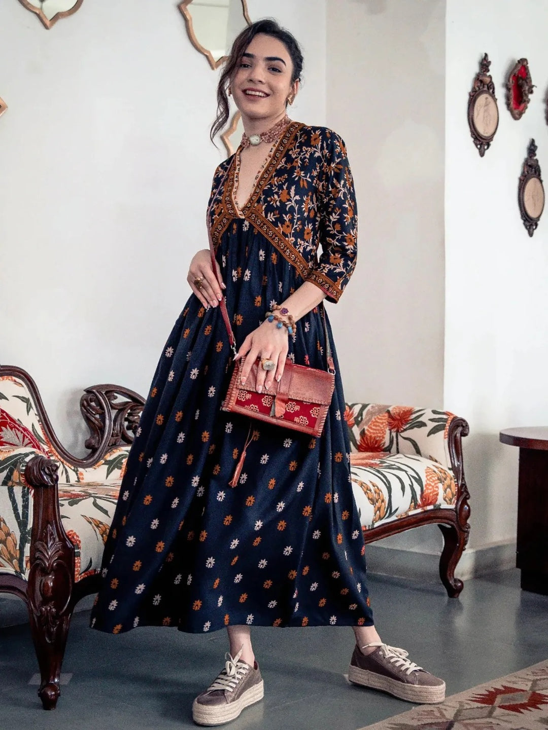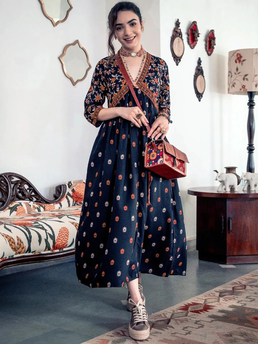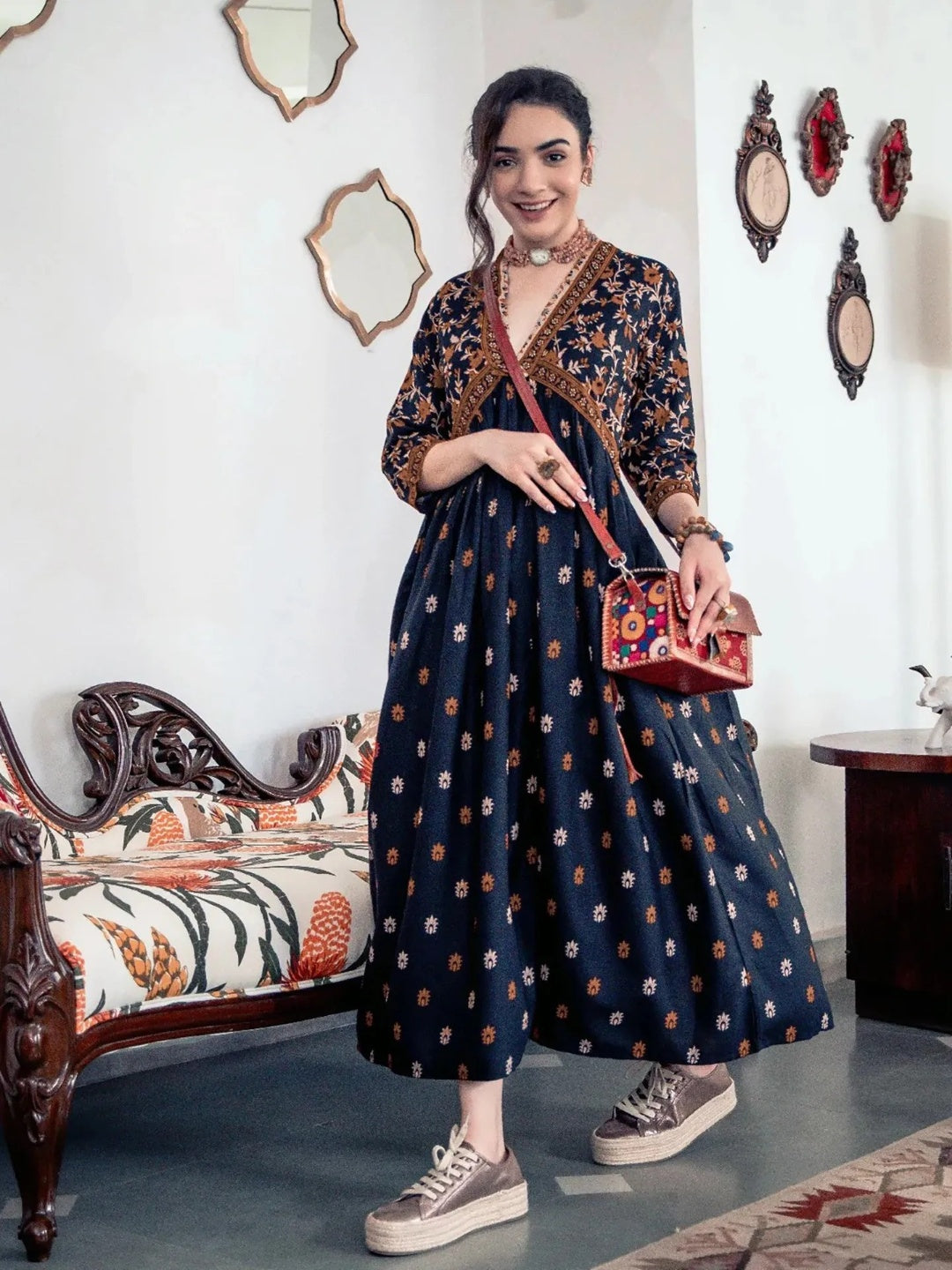 Entice the onlookers with the beauty of black with this lovely dress. To make you look resplendent, there is a combination of maroon and white that add further sheen to the black fabric. The trendy V neck design will look chic in any setting and you will surely love the overall comfort factor and feel of the elegantly crafted dress. For the best effect, pair this up with some stylish jhumka earrings to dazzle the observers.