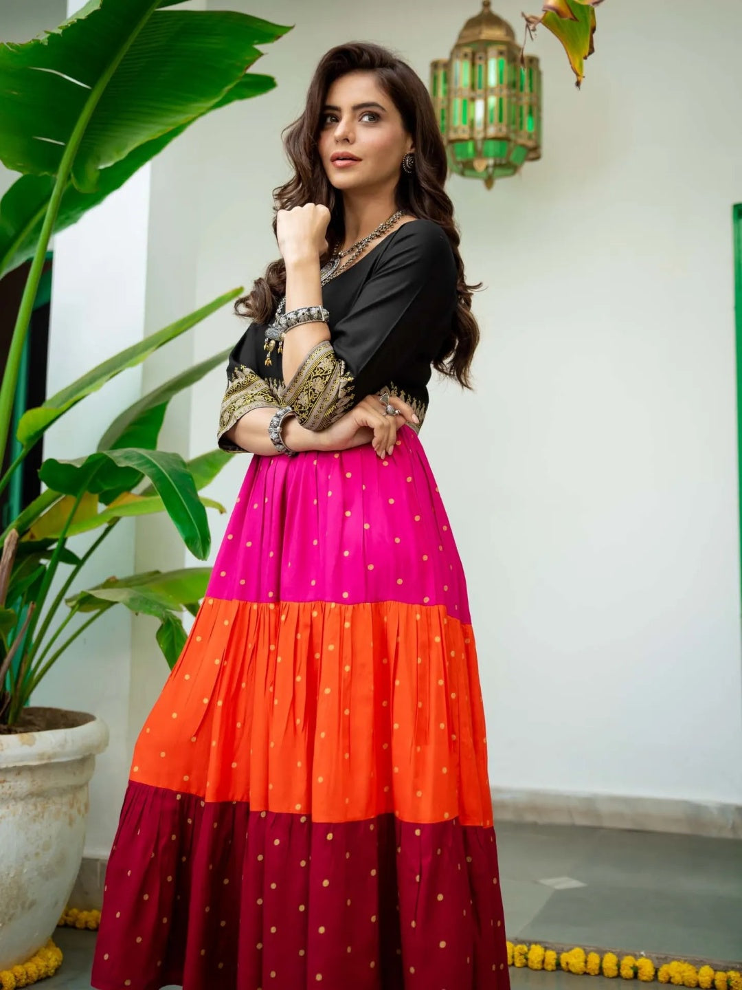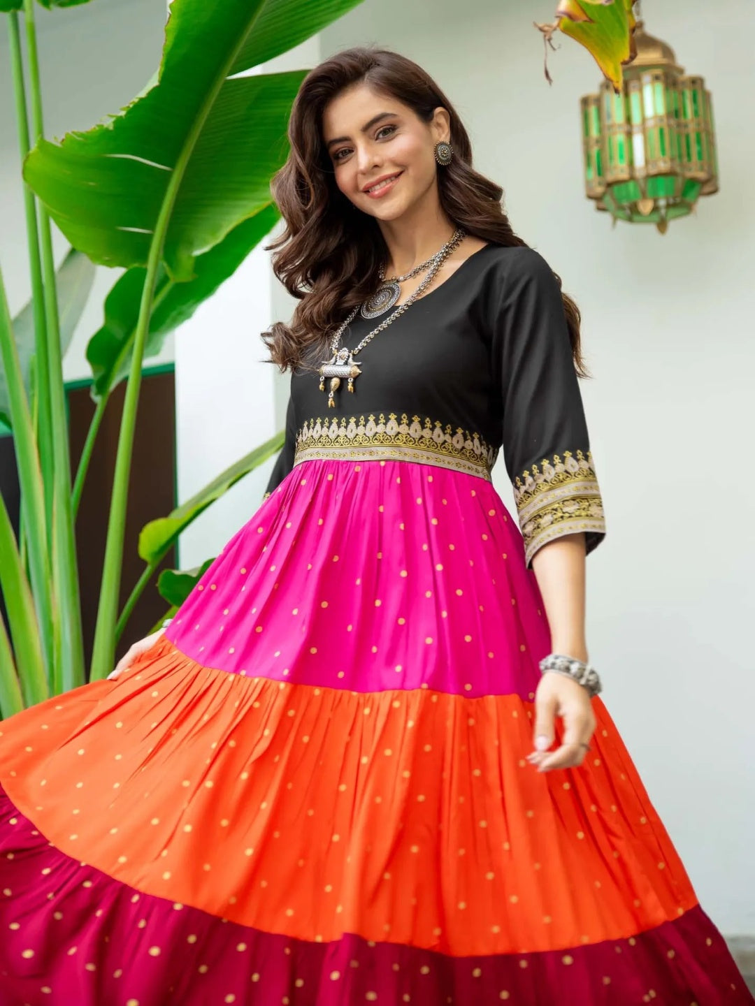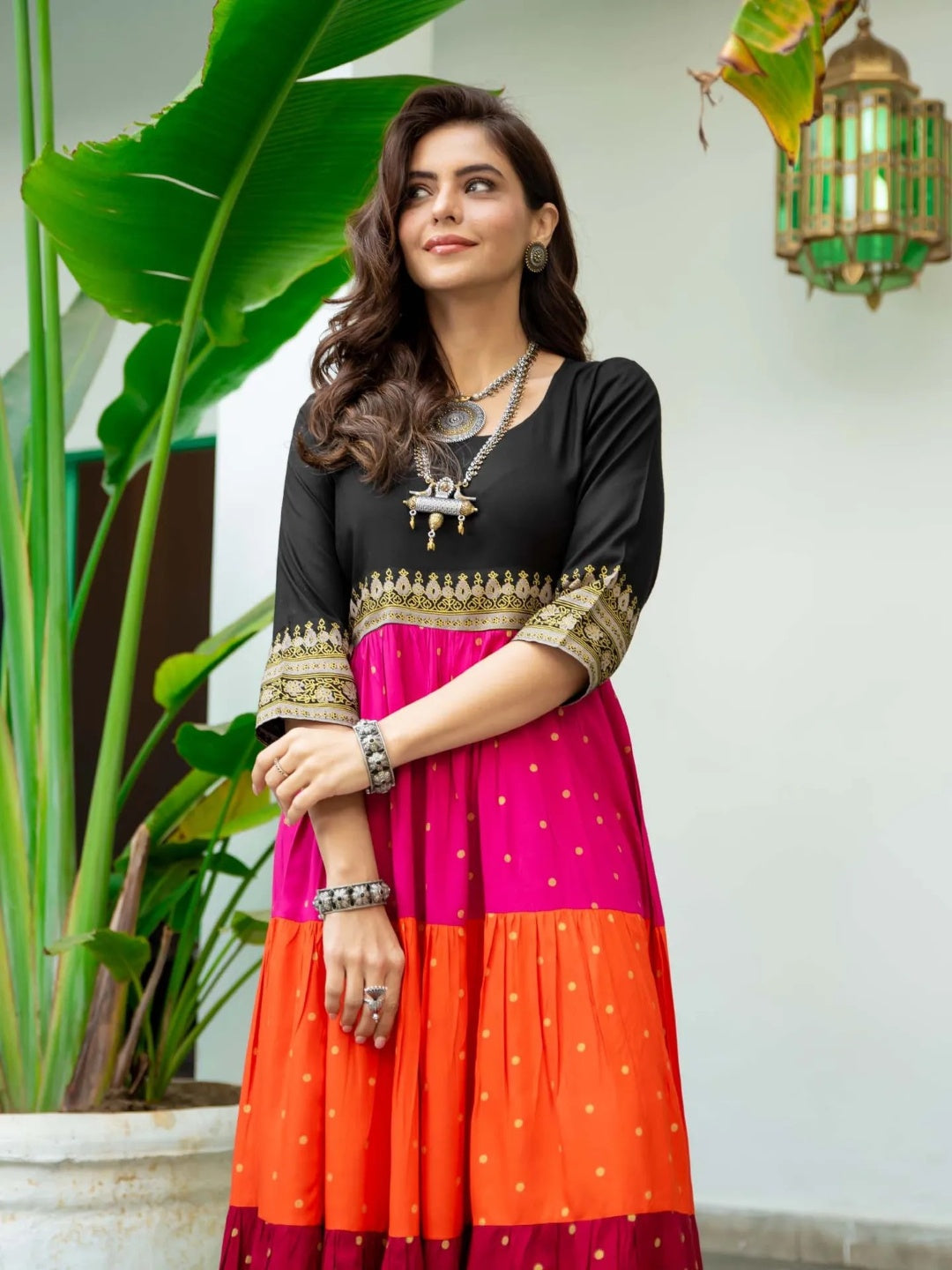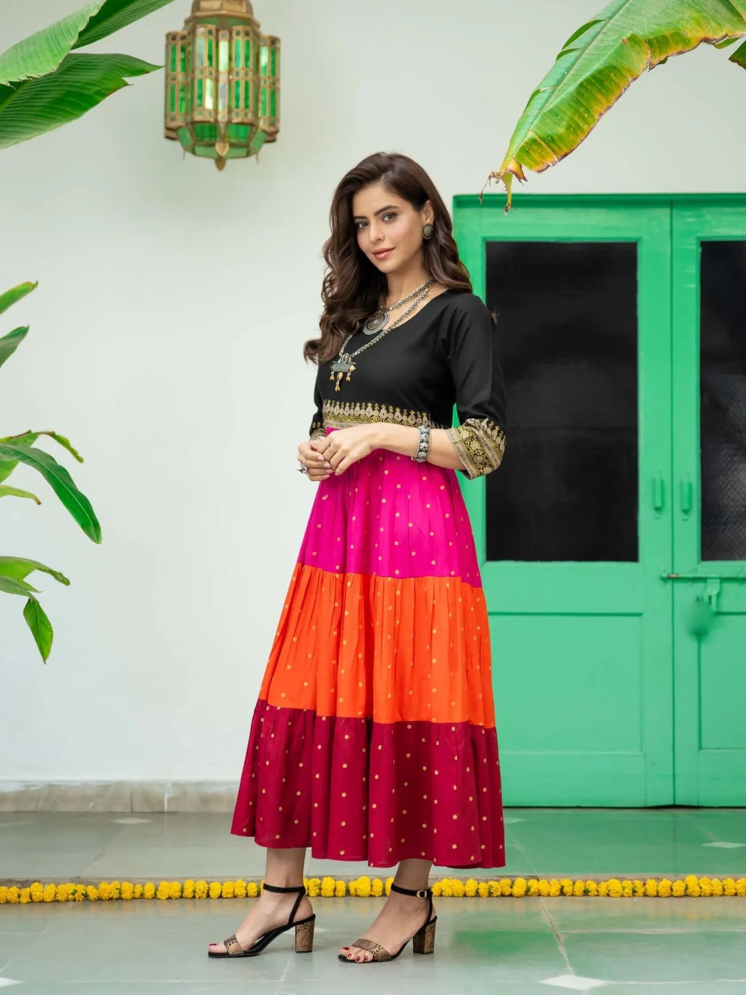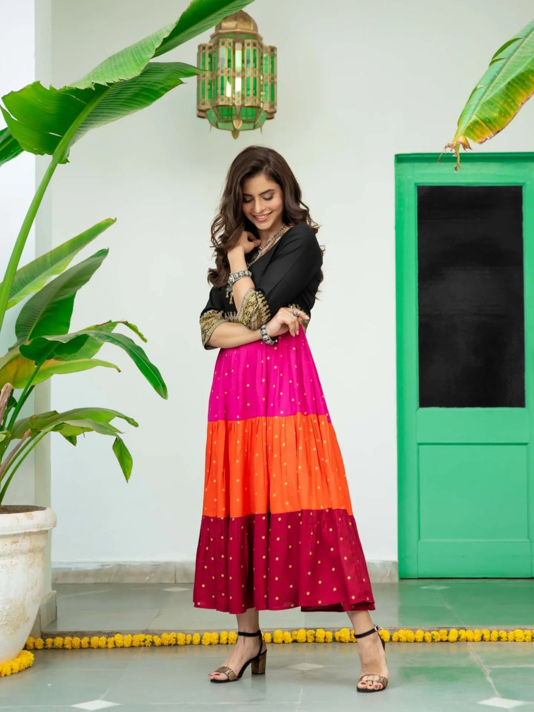 Fall in love with this beautiful flared tiered dress that is a classic example of traditional meeting contemporary. beautiful indian motifs and quirky polka prints adorn this design. and there is lovely gota detailing on the sleeves to make it perfect for any occasion. as always, this is crafted from breathable and sustainable liva rayon fabrics.
