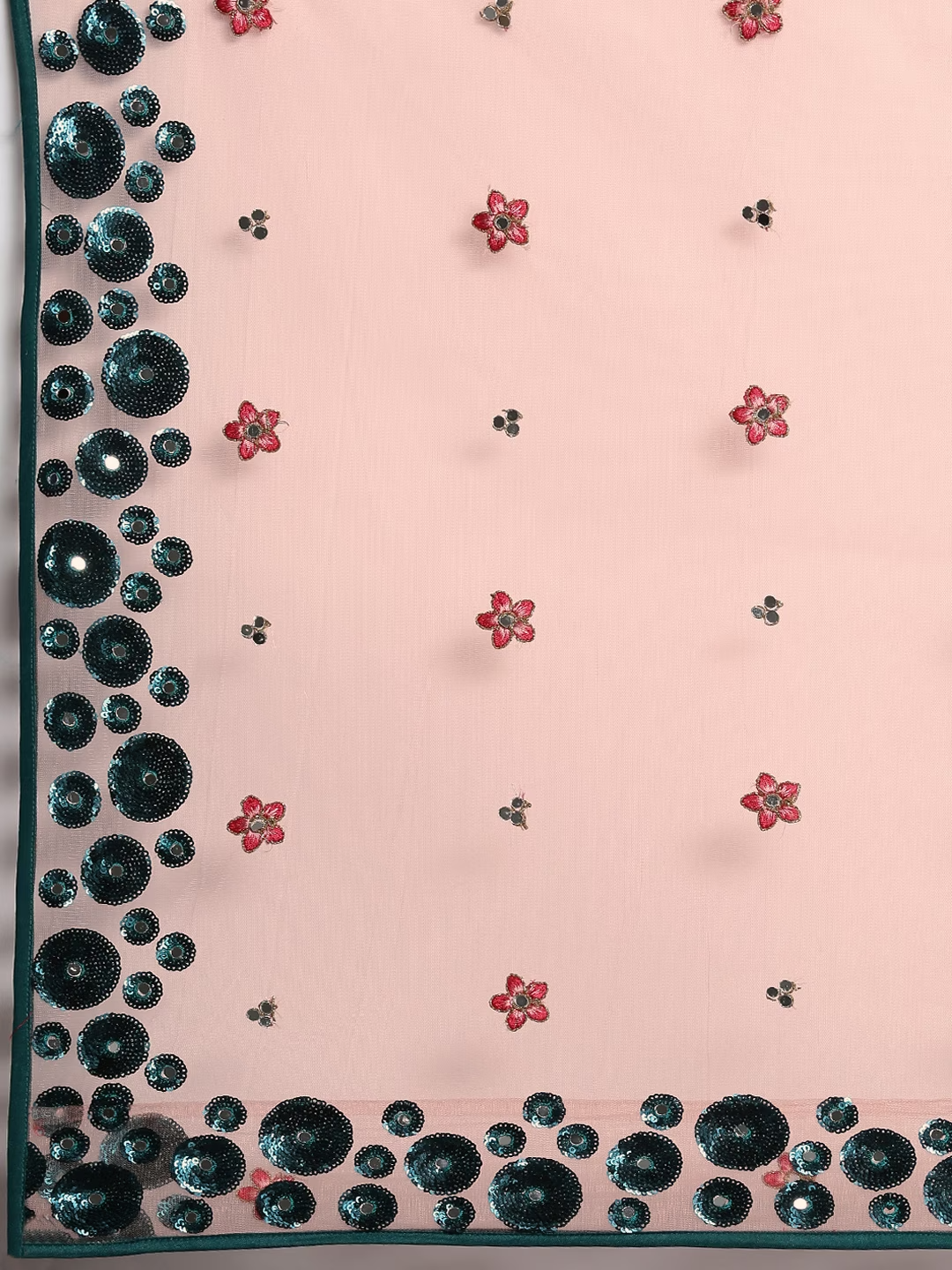 - Embroidered unstitched blouse, has a round neck, short sleeves, pink and silver-toned embroidered semi-stitched lehenga, has drawstring closure, flared hem