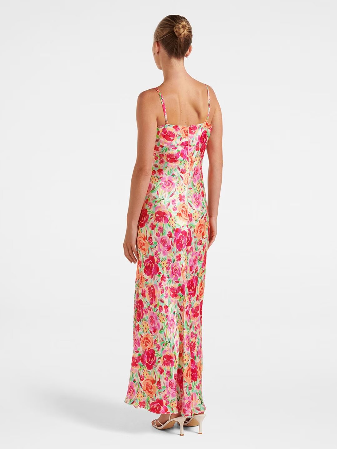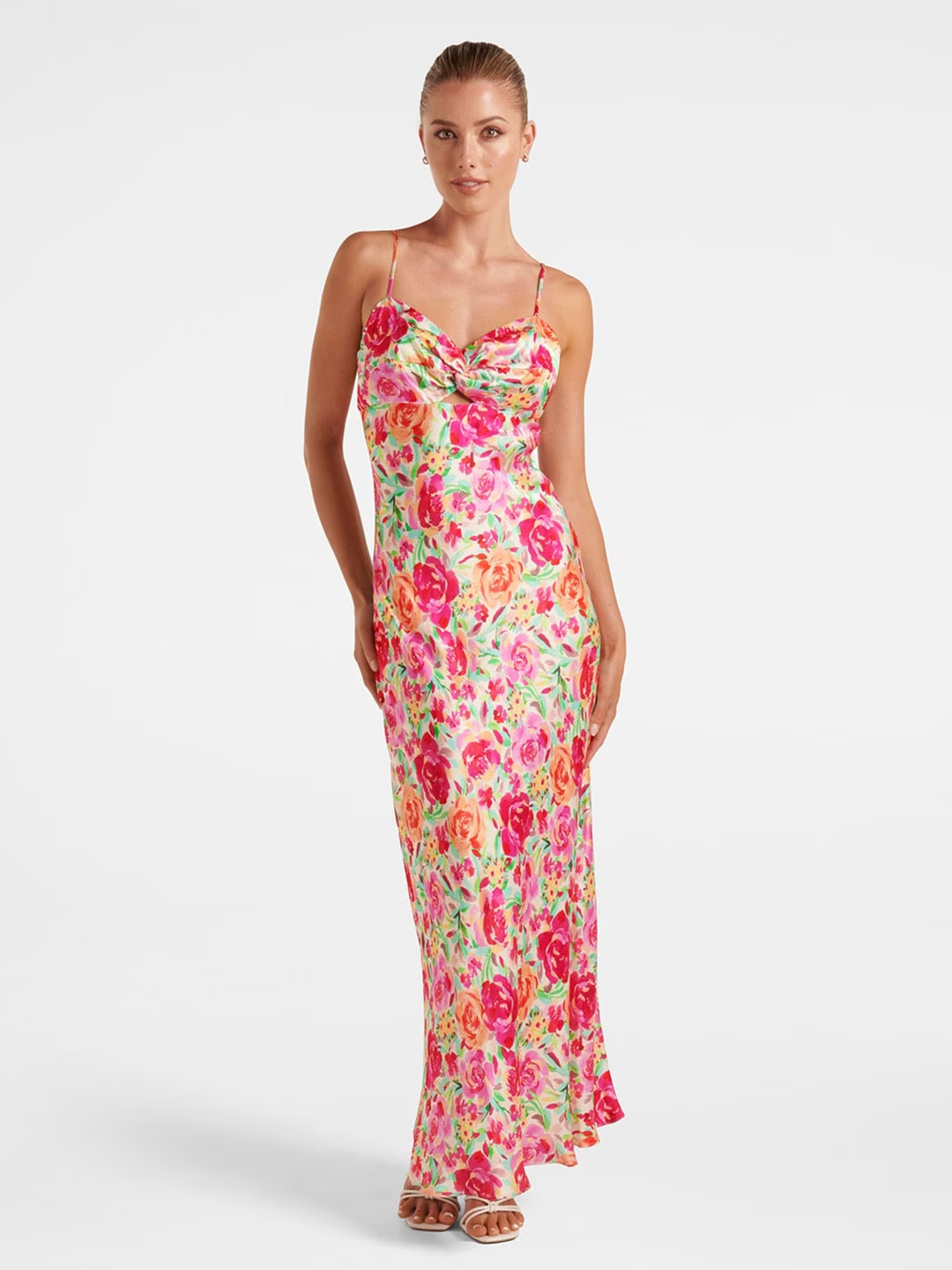 - Beige, pink and green floral print maxi dress