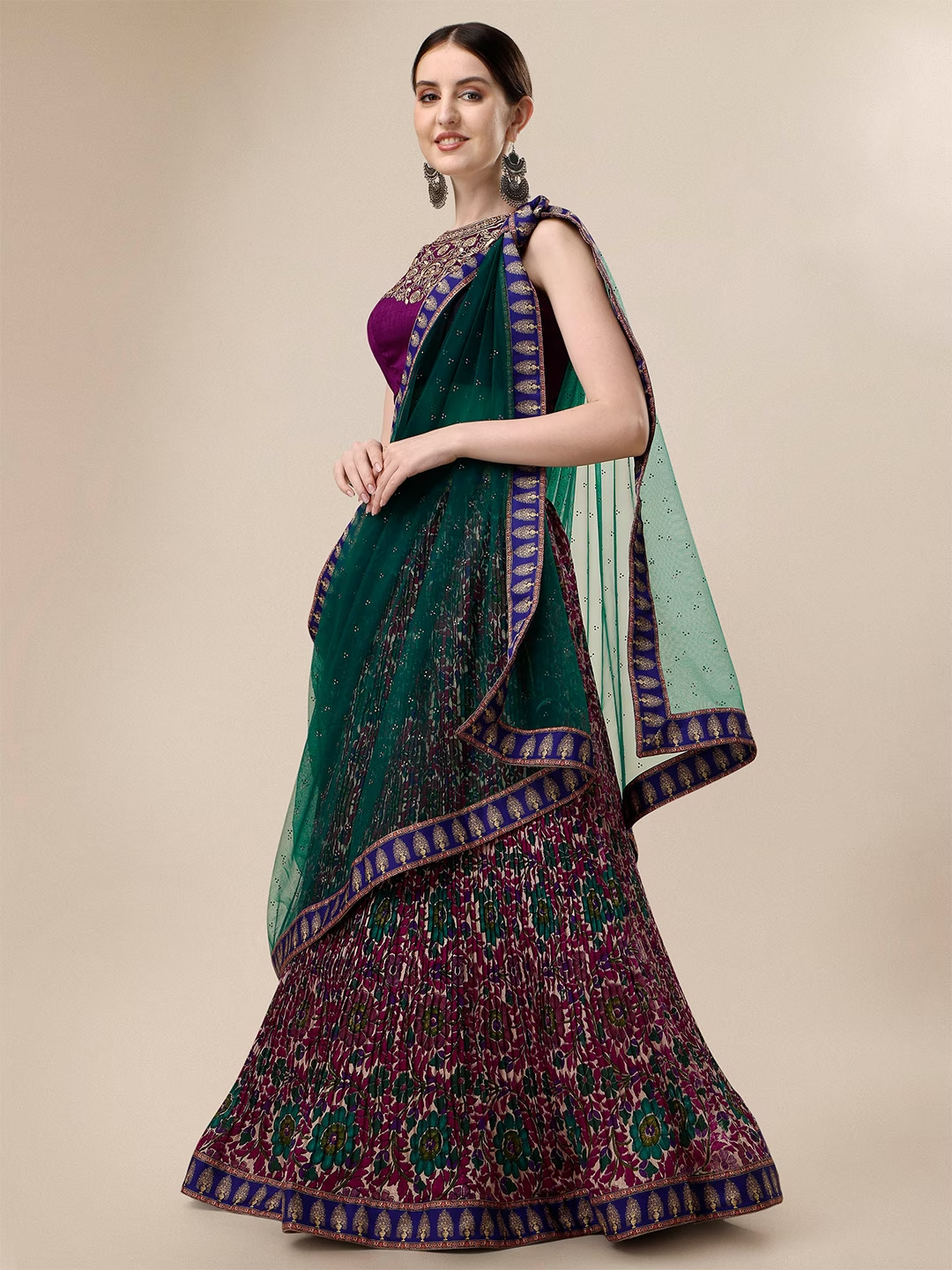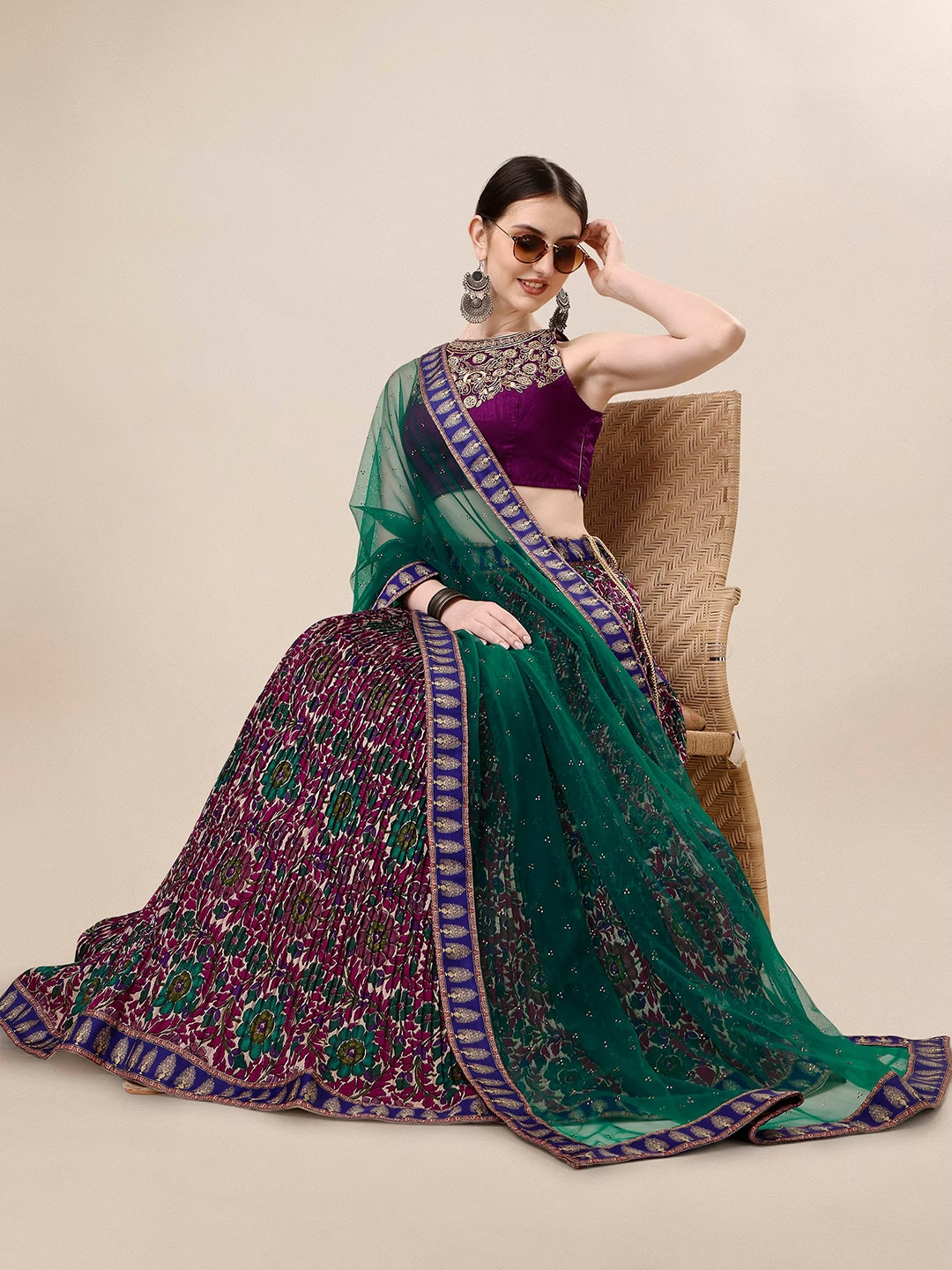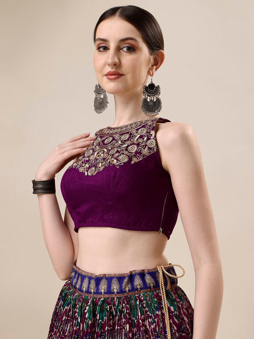 - Green and purple embroidered ready to wear blouse, has a boat neck, three-quarter sleeves, green and purple printed ready to wear lehenga, has slip-on closure, flared hem