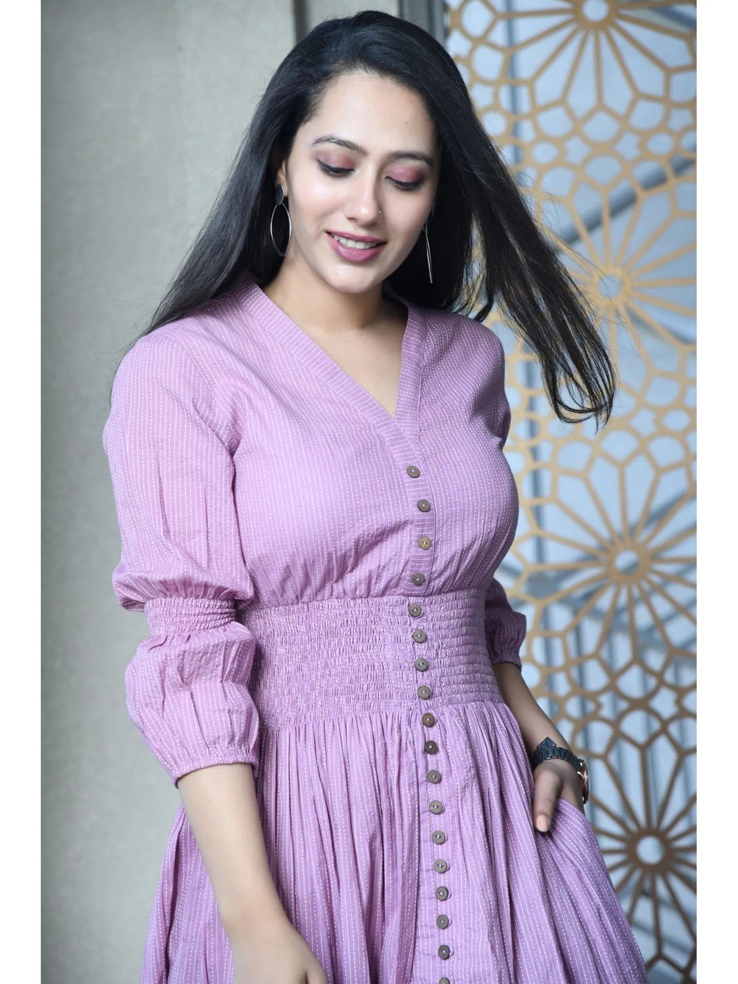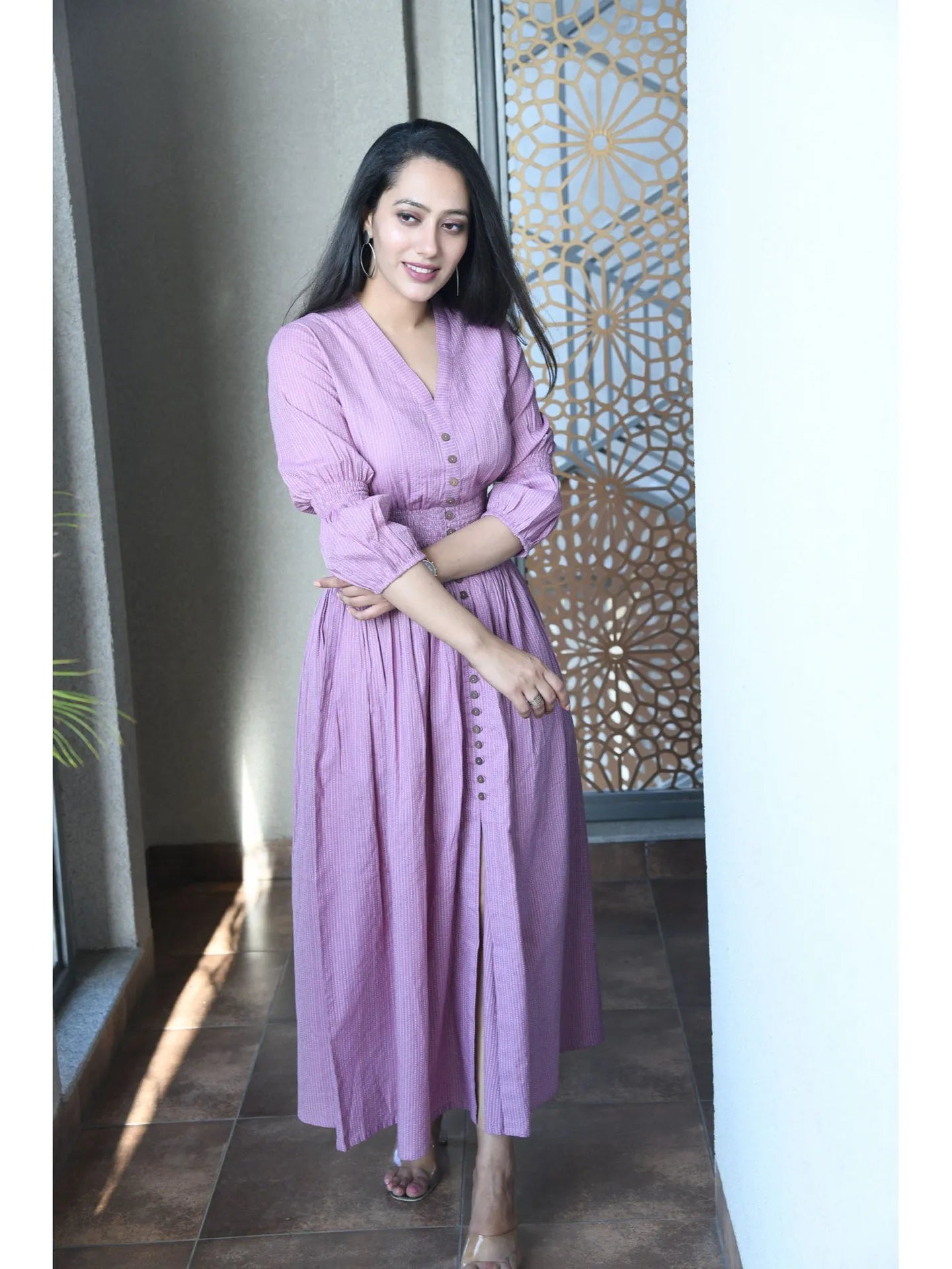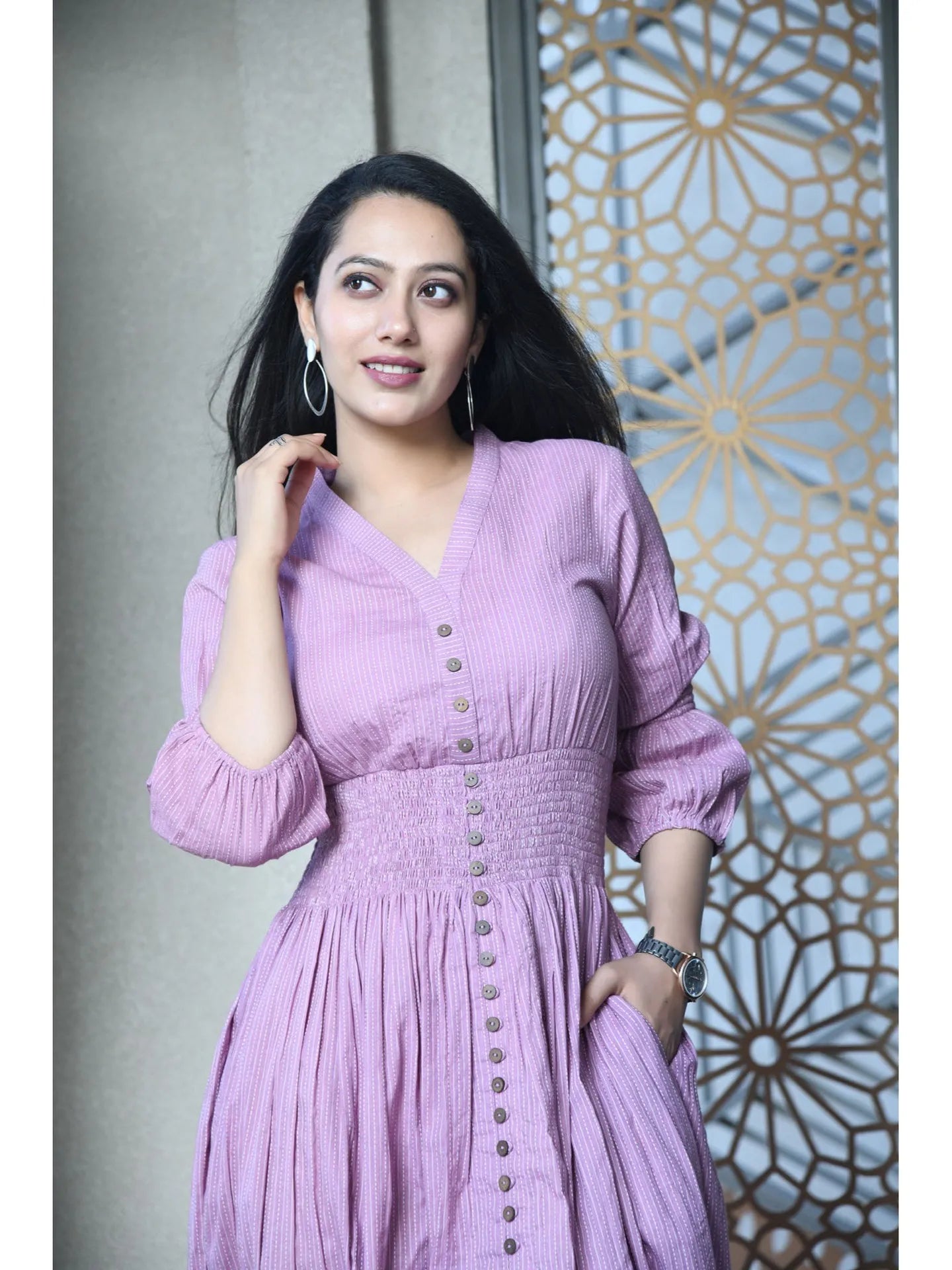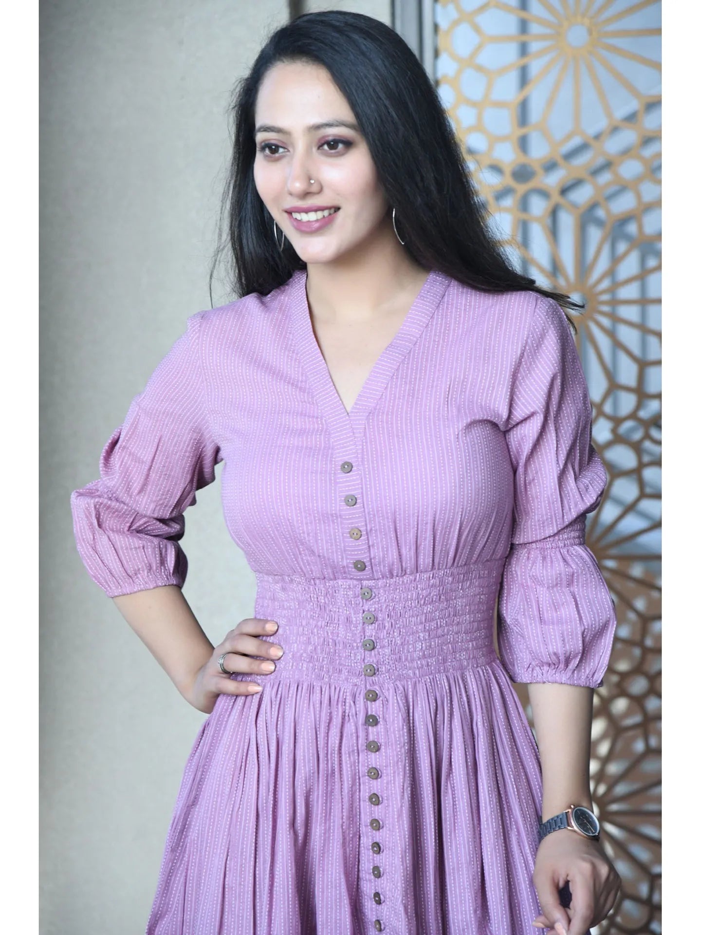 Leave a lasting impression with this beautiful purple dress.Tailored from cotton, it features a V-neck, front closure, and is accented with striped detailing. Style it with a pair of hoop earrings and kitten heels to complete the chic look.