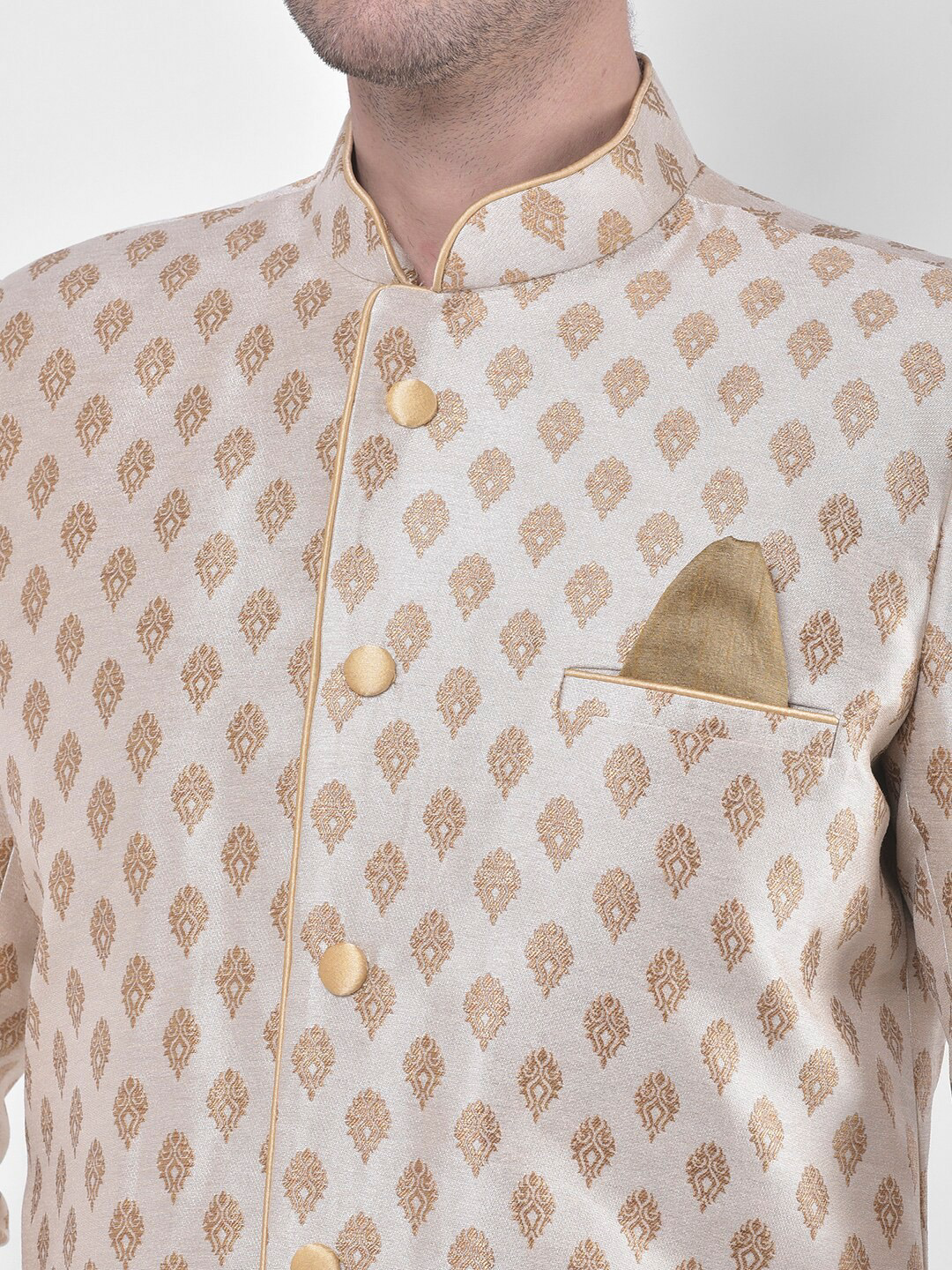 - Cream-coloured woven design Jacquard sherwani, has a mandarin collar, long sleeves, a button placket, straight hem and welt pocket