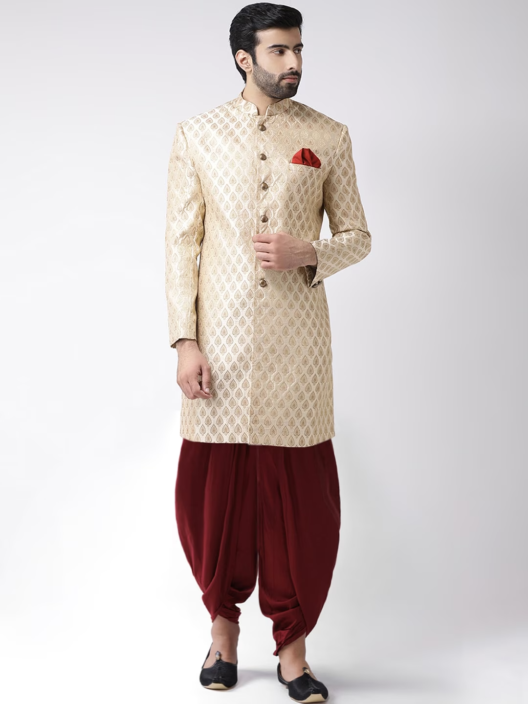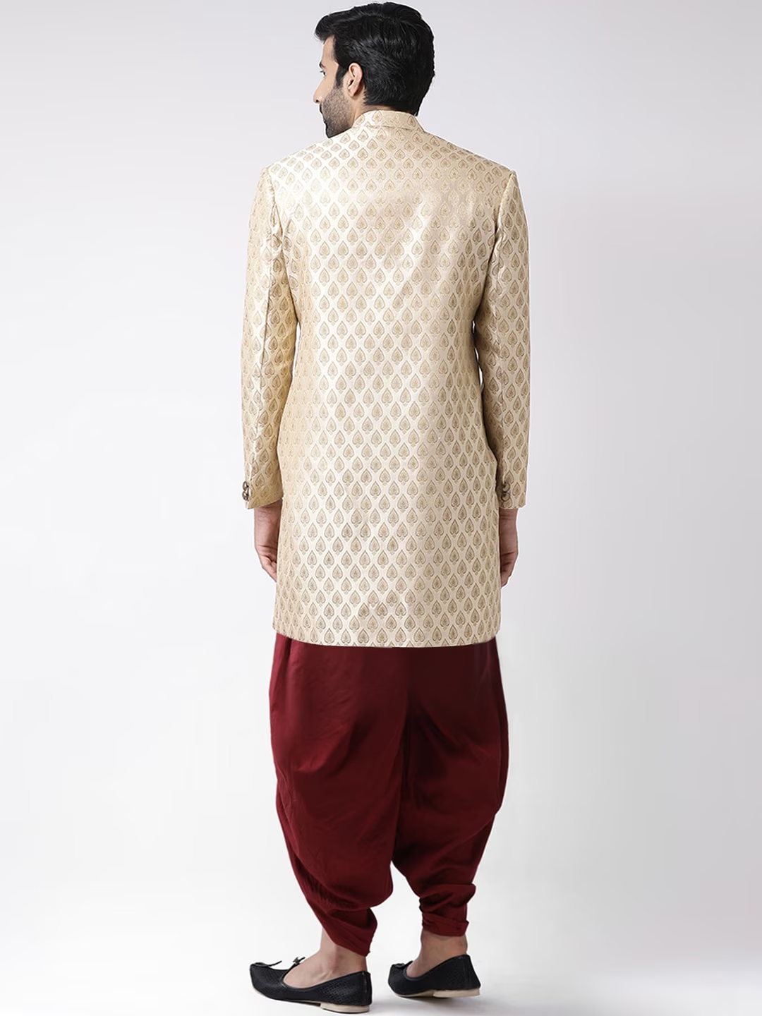 - Gold-coloured and beige printed regular-fit sherwani, has a mandarin collar, a button placket, long sleeves, one chest welt pocket, and multiple slits