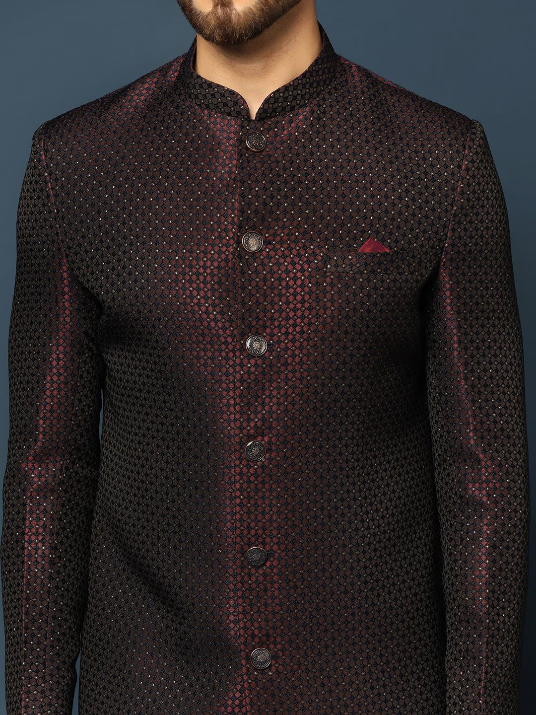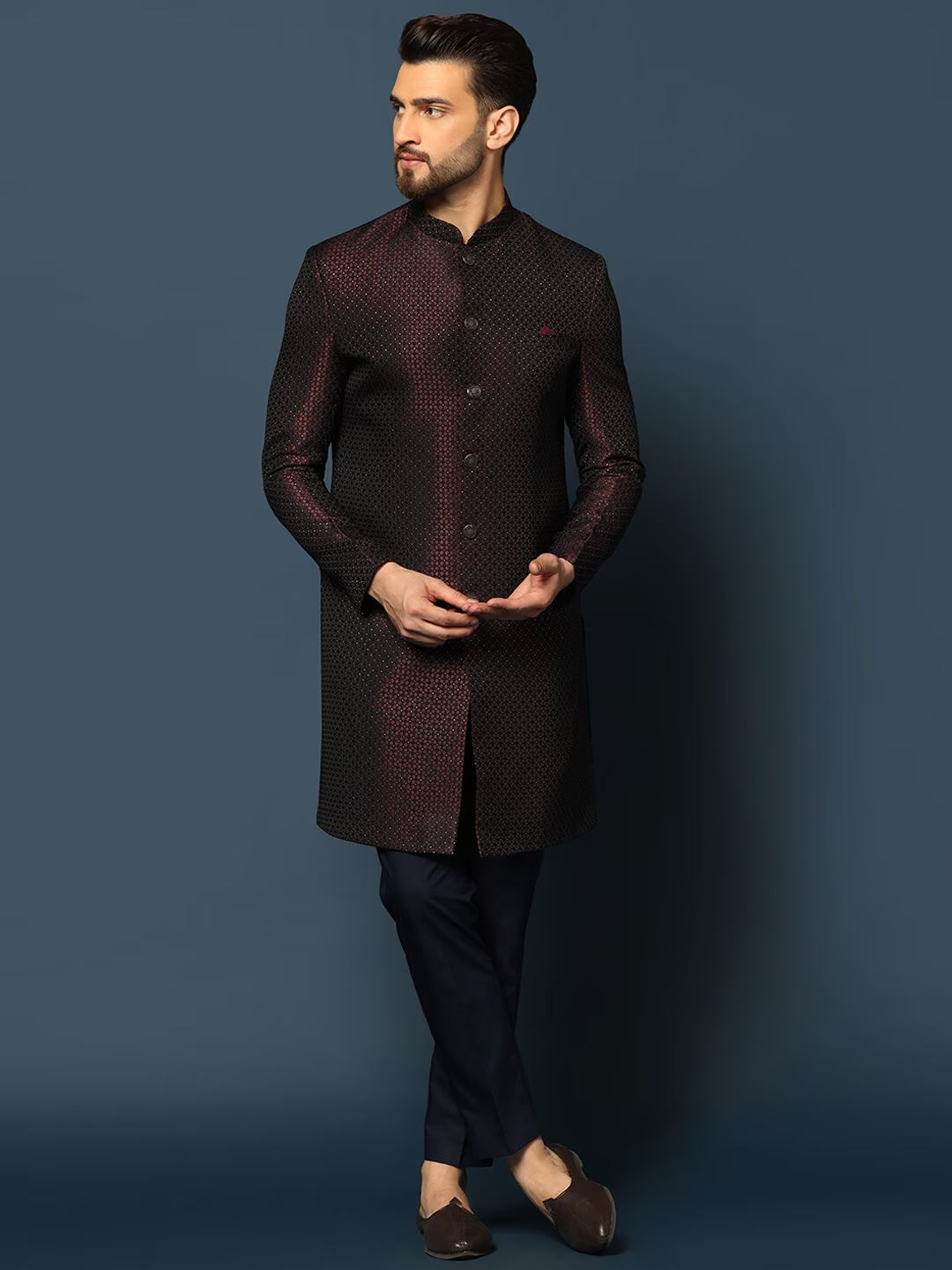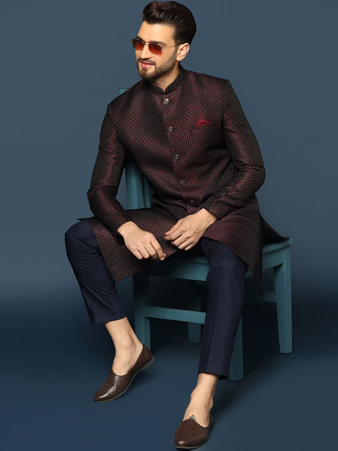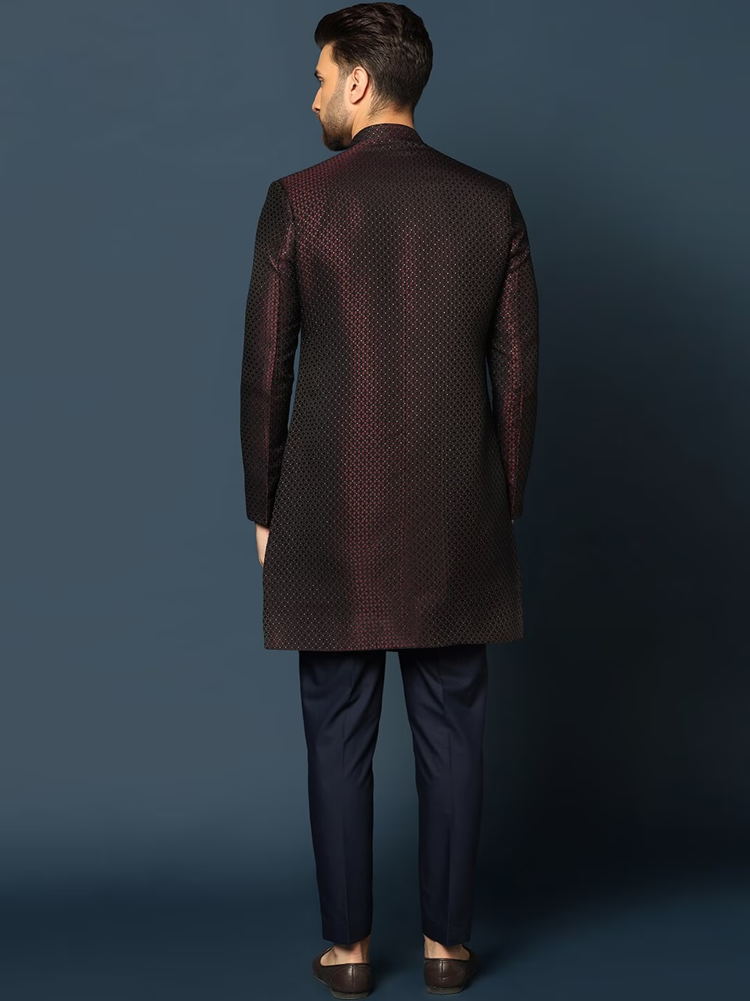 - Maroon self-design sherwani, has a mandarin collar, stylised front with button closures and long sleeves