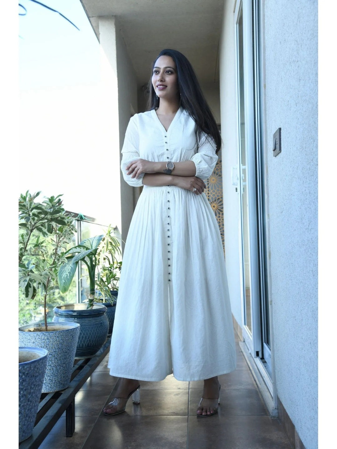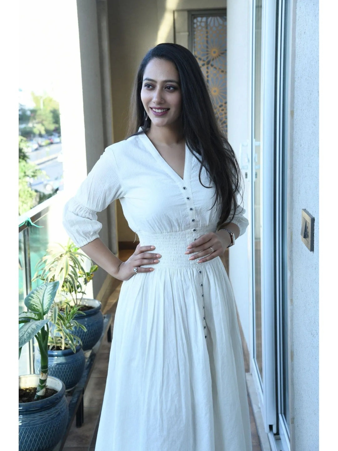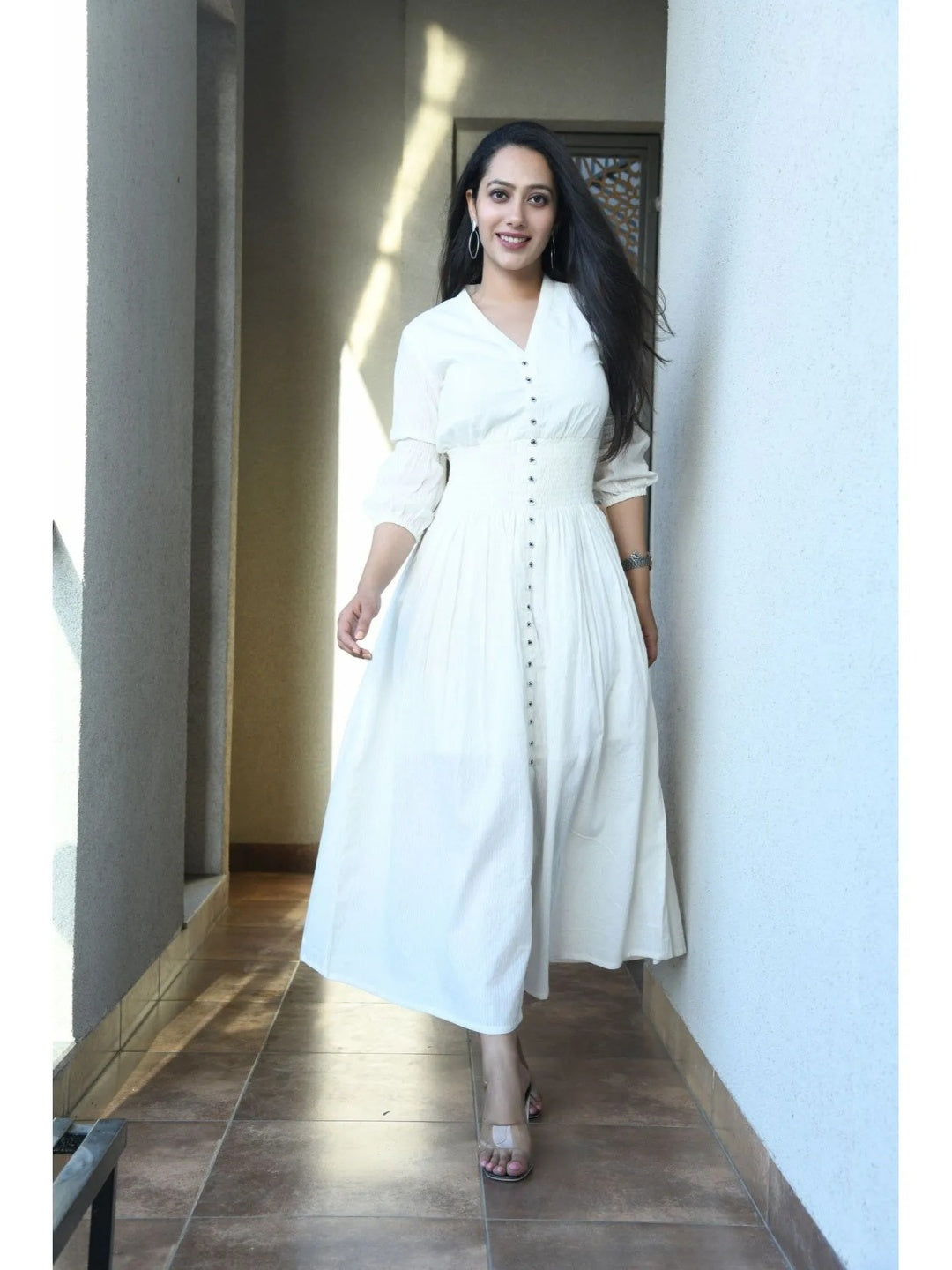 Leave a lasting impression with this beautiful off-white dress from Navaani. Tailored from cotton, it features a V-neck, front closure, and is accented with striped detailing. Style it with a pair of hoop earrings and kitten heels to complete the chic look.