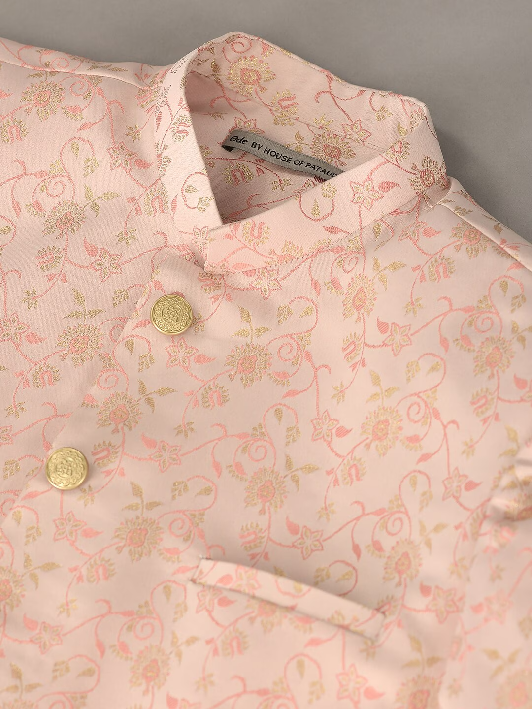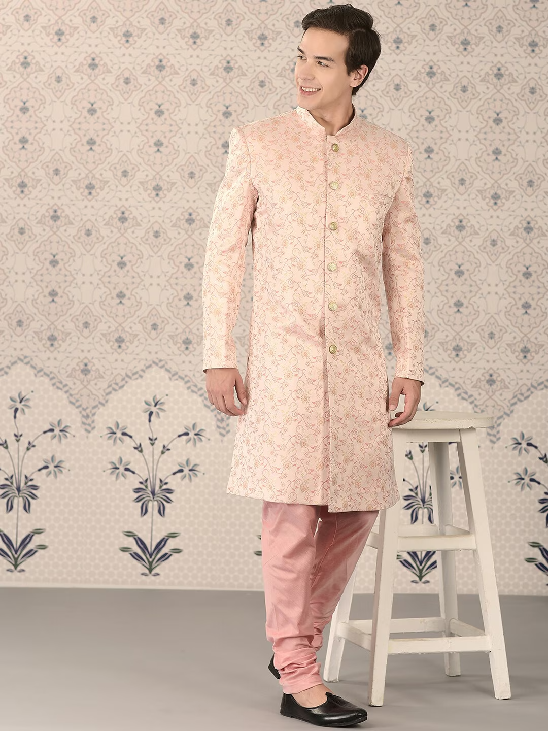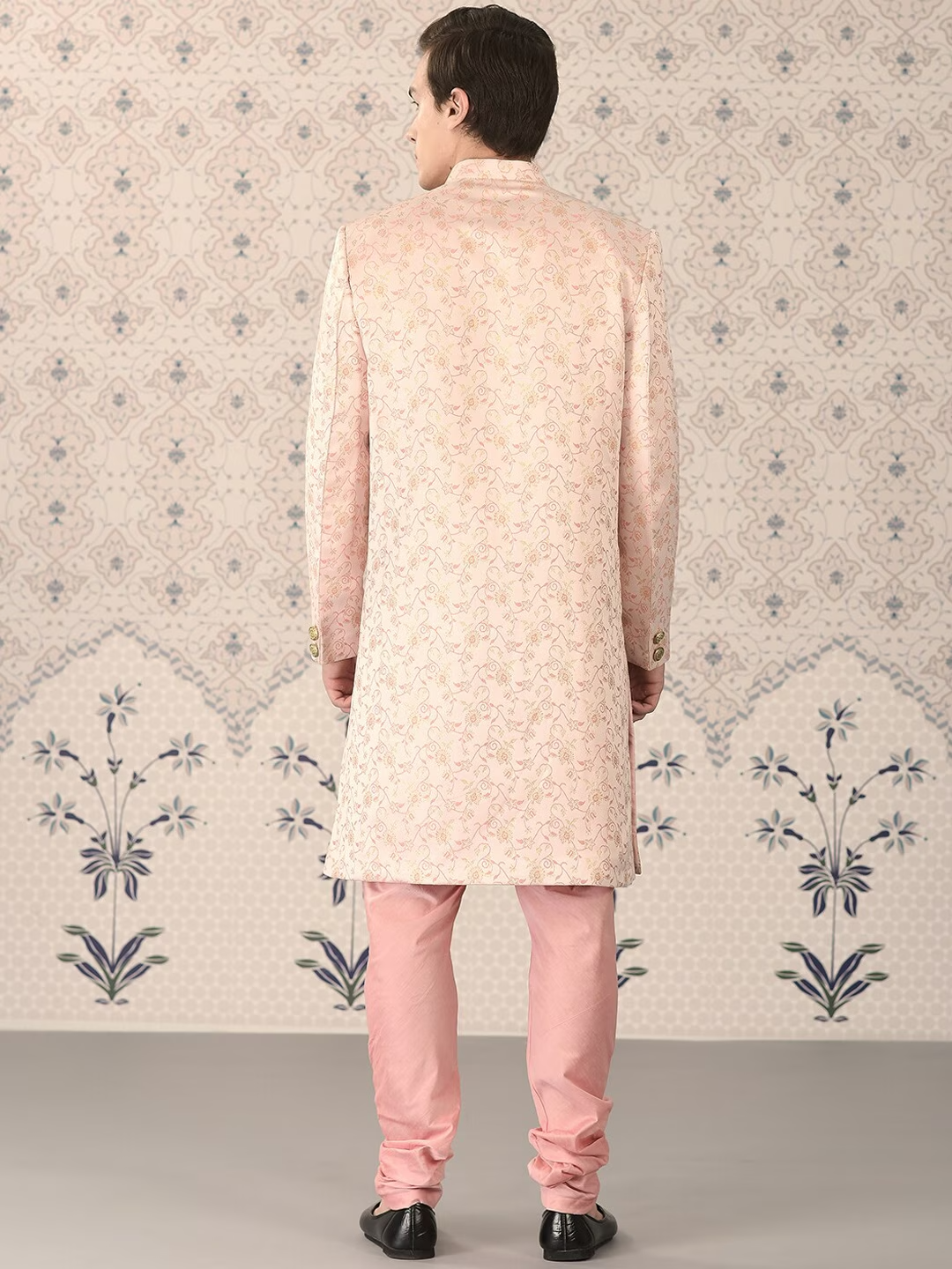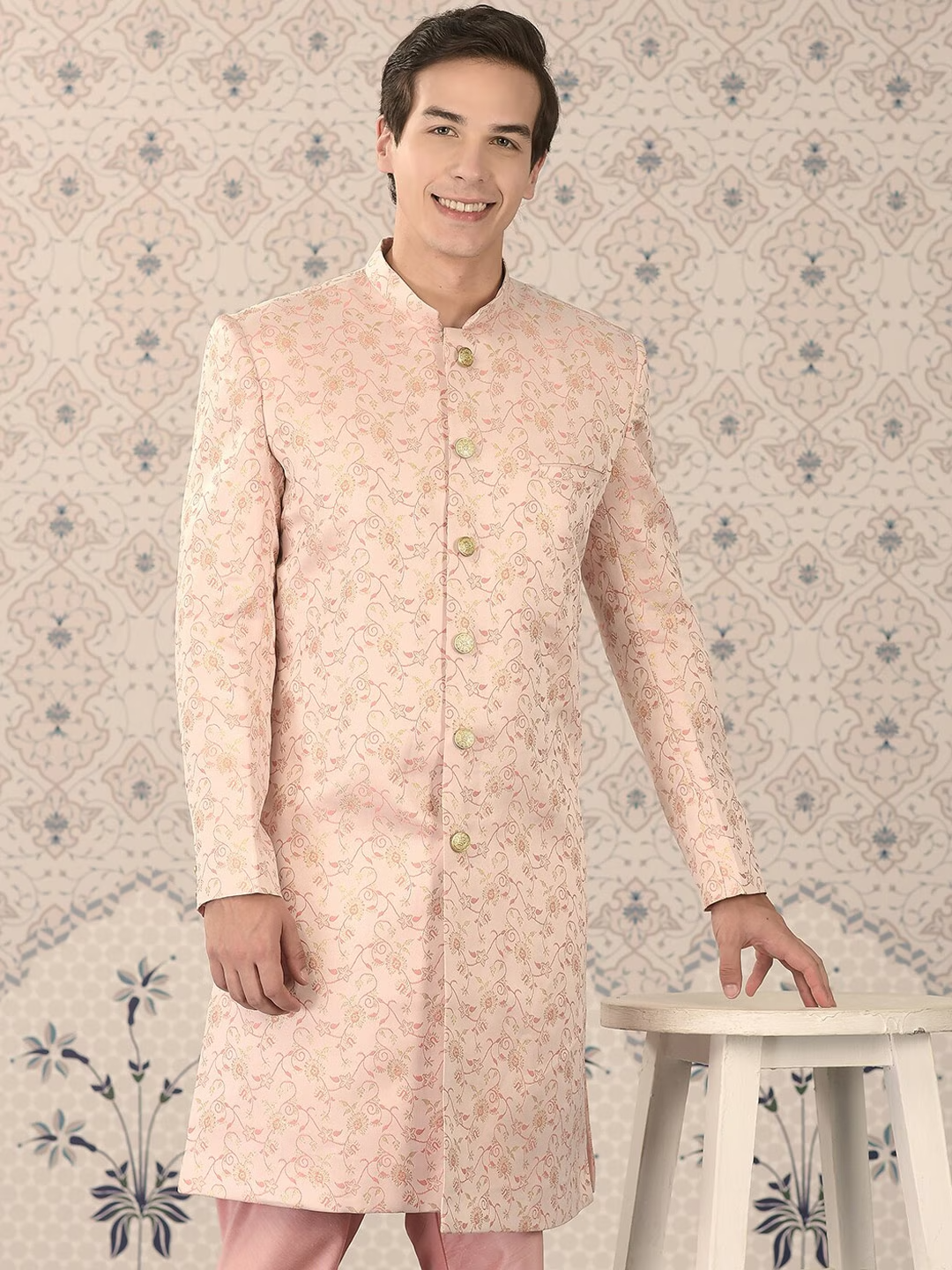 - Peach coloured woven design sherwani, has a mandarin collar, stylised front with button closures, long sleeves
