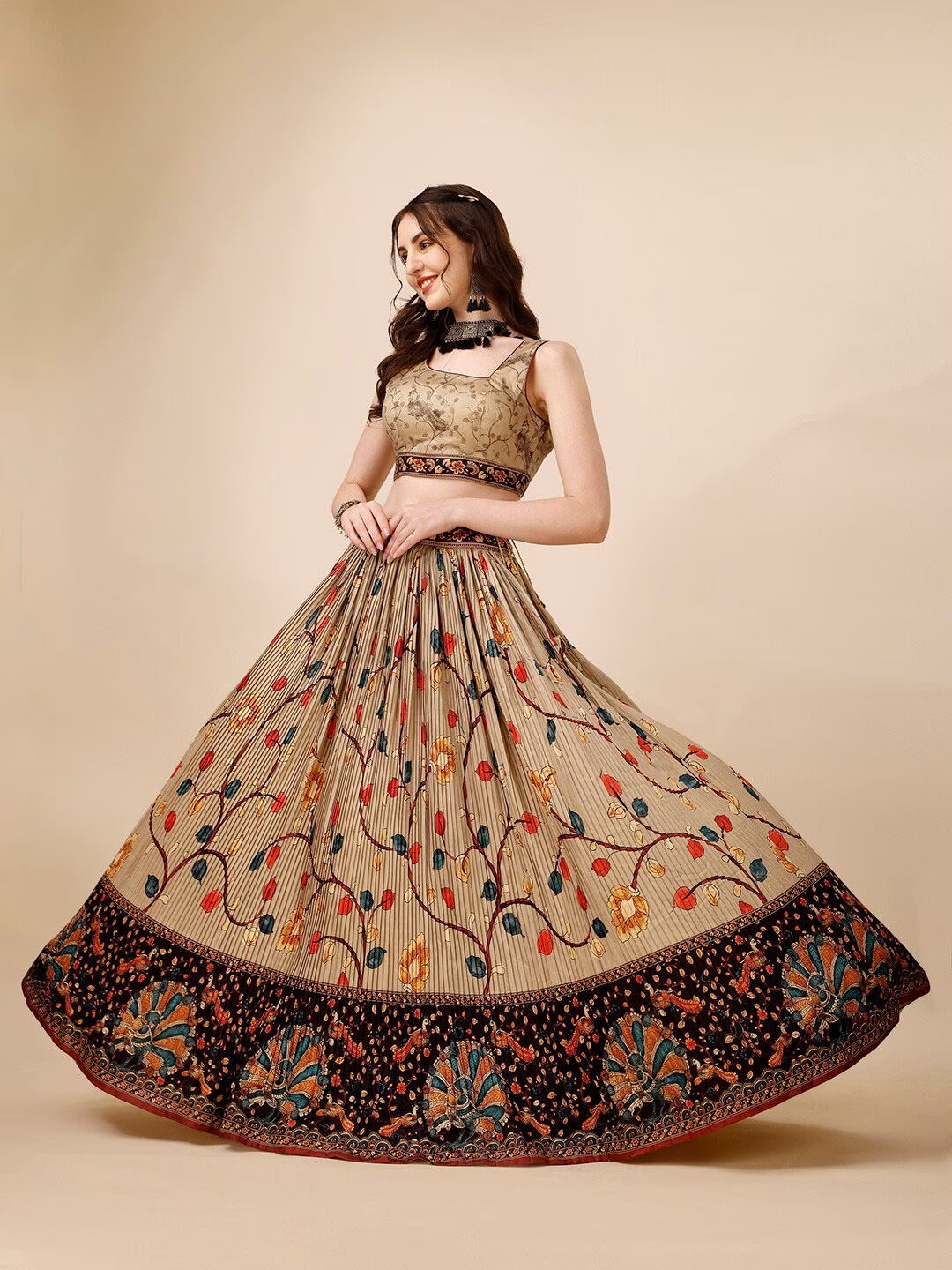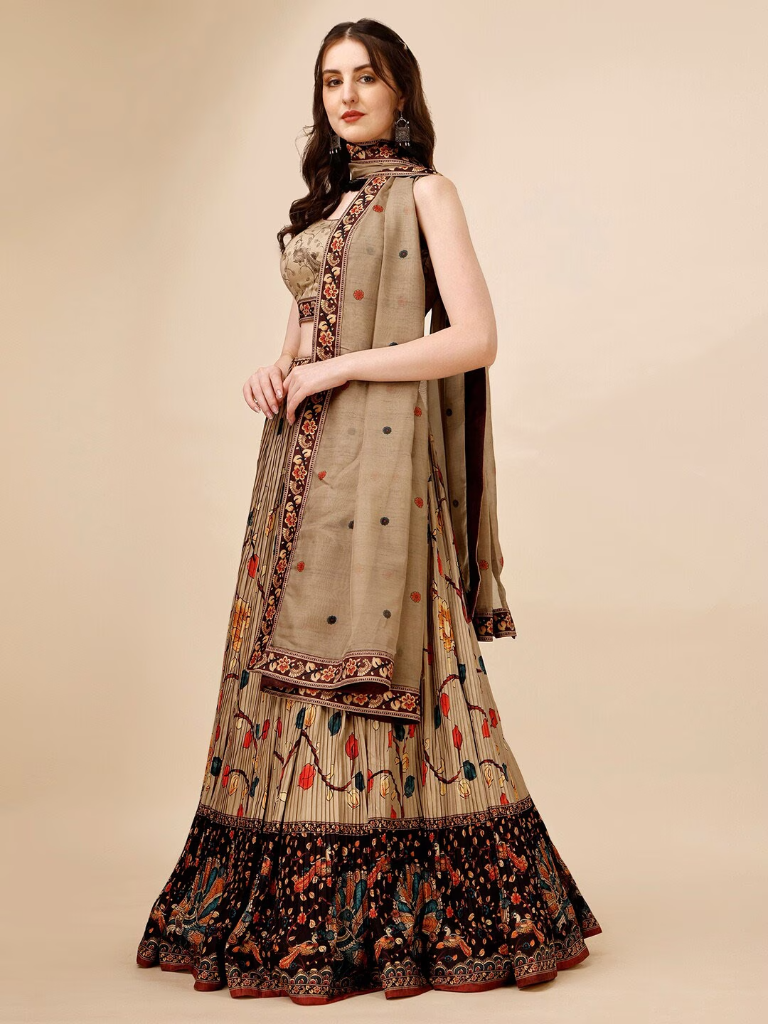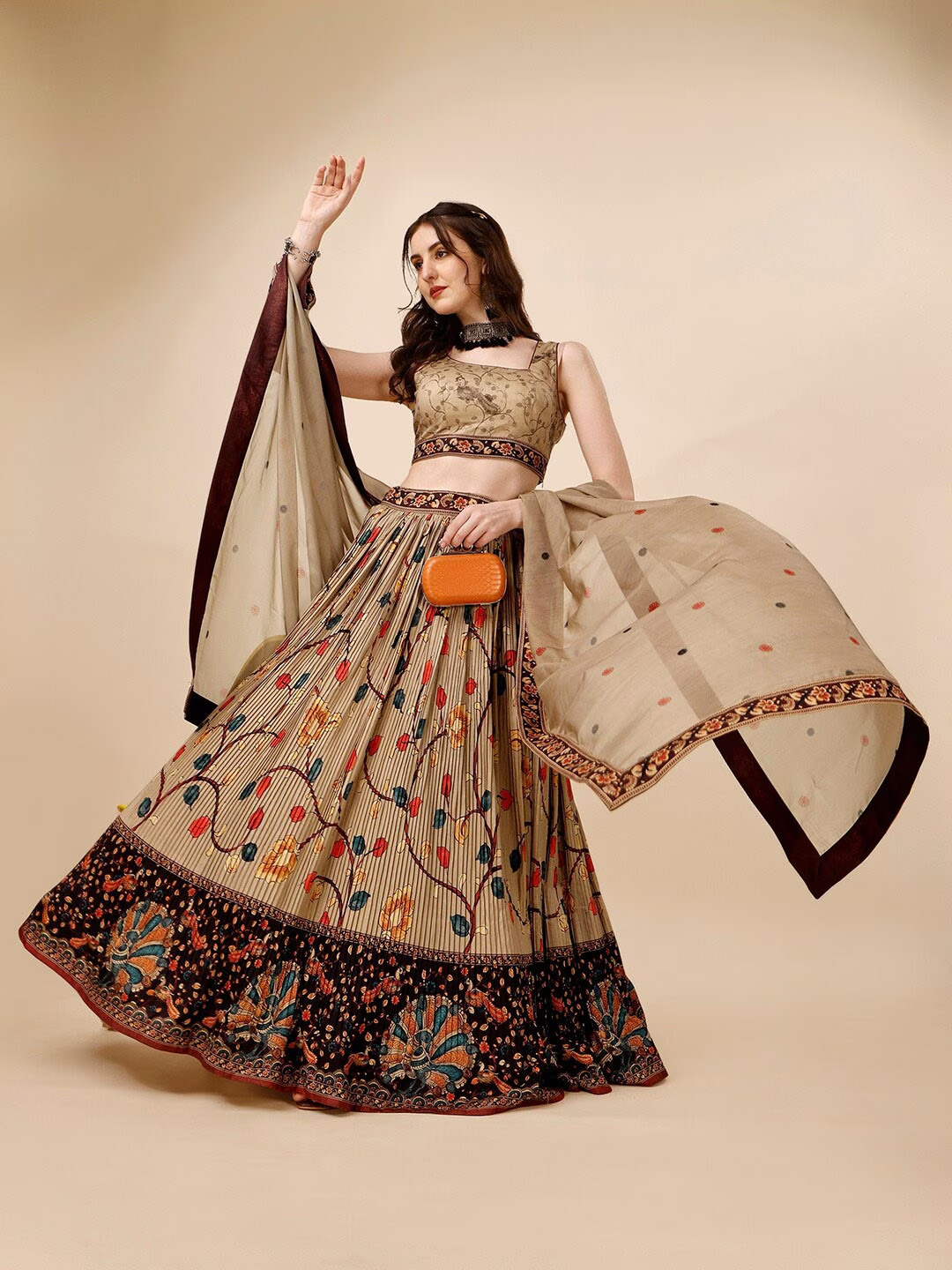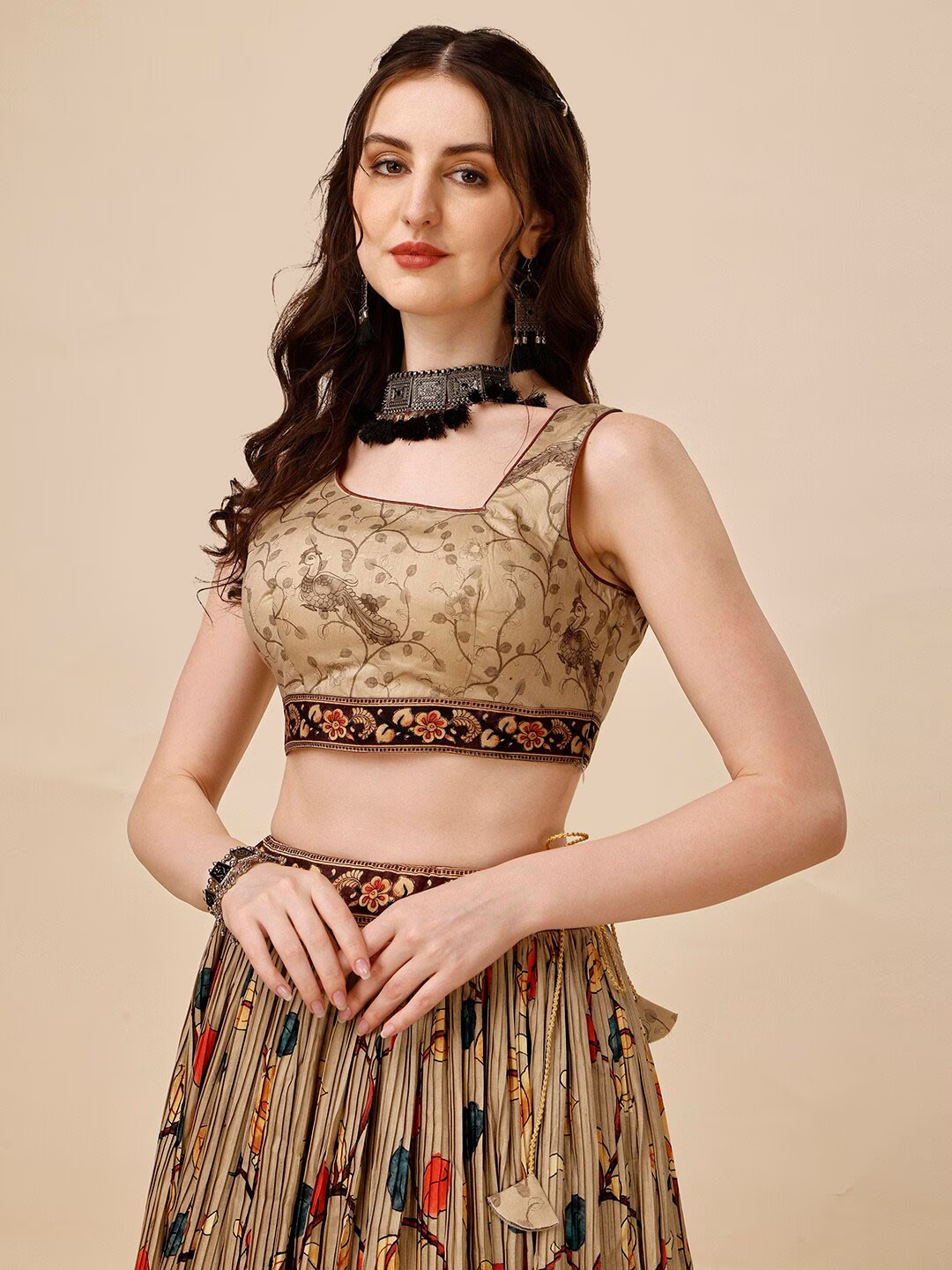 - Brown and orange printed ready to wear blouse, has a square neck, sleeveless, brown and orange printed ready to wear lehenga, has slip-on closure, flared hem