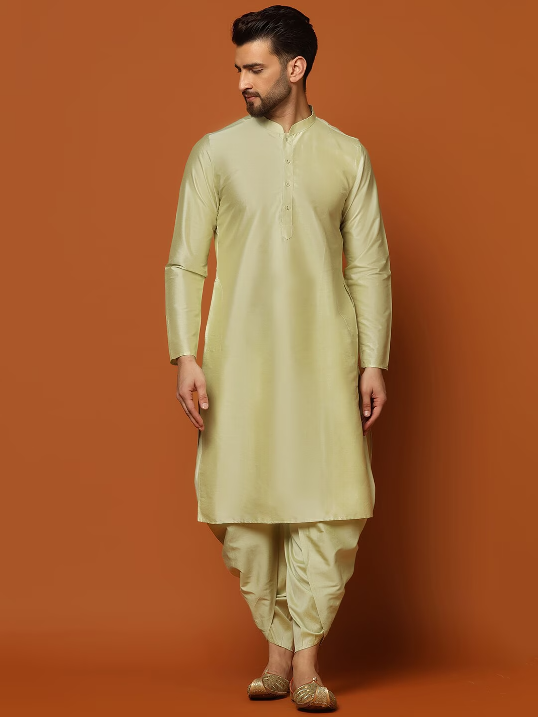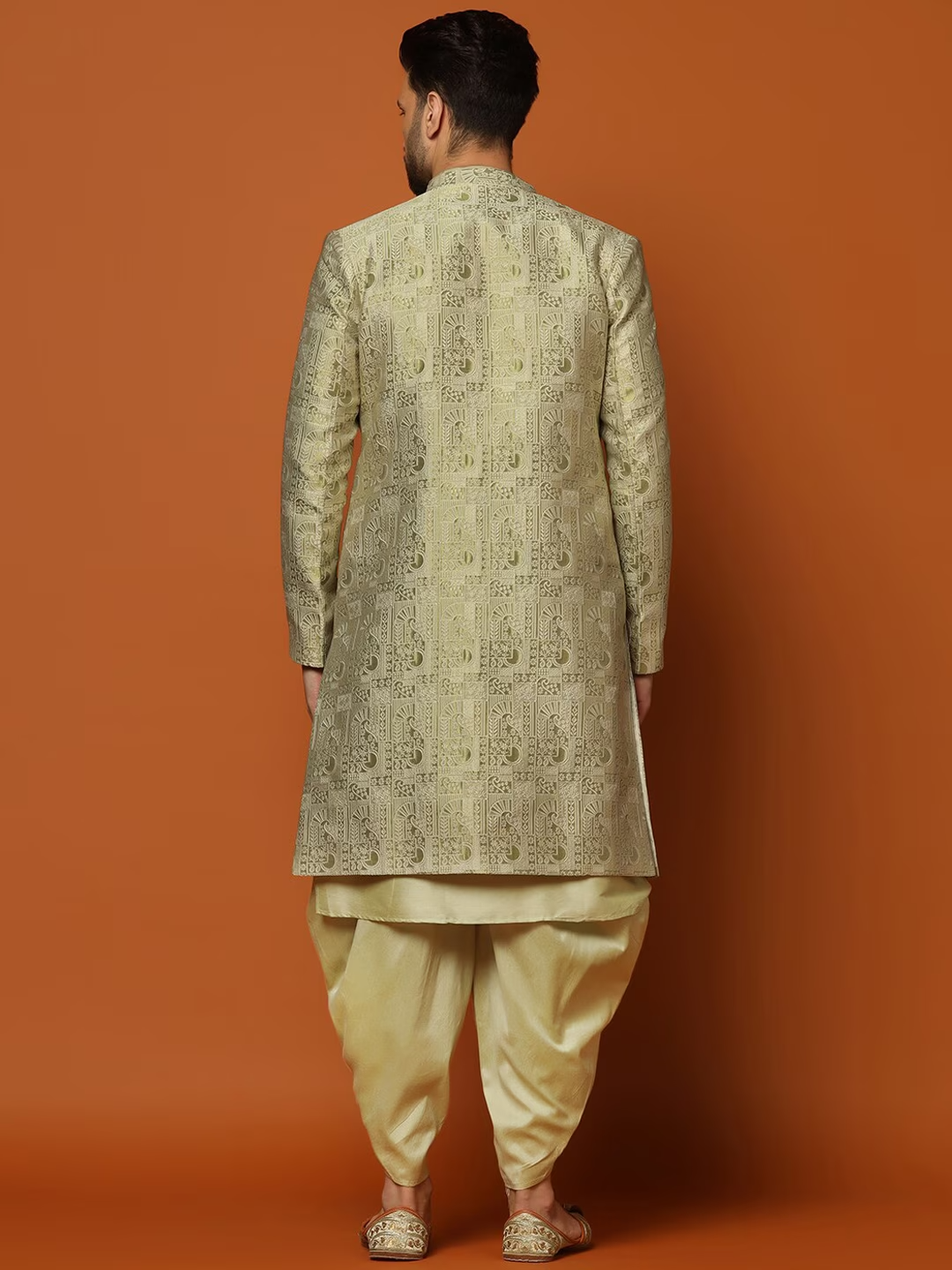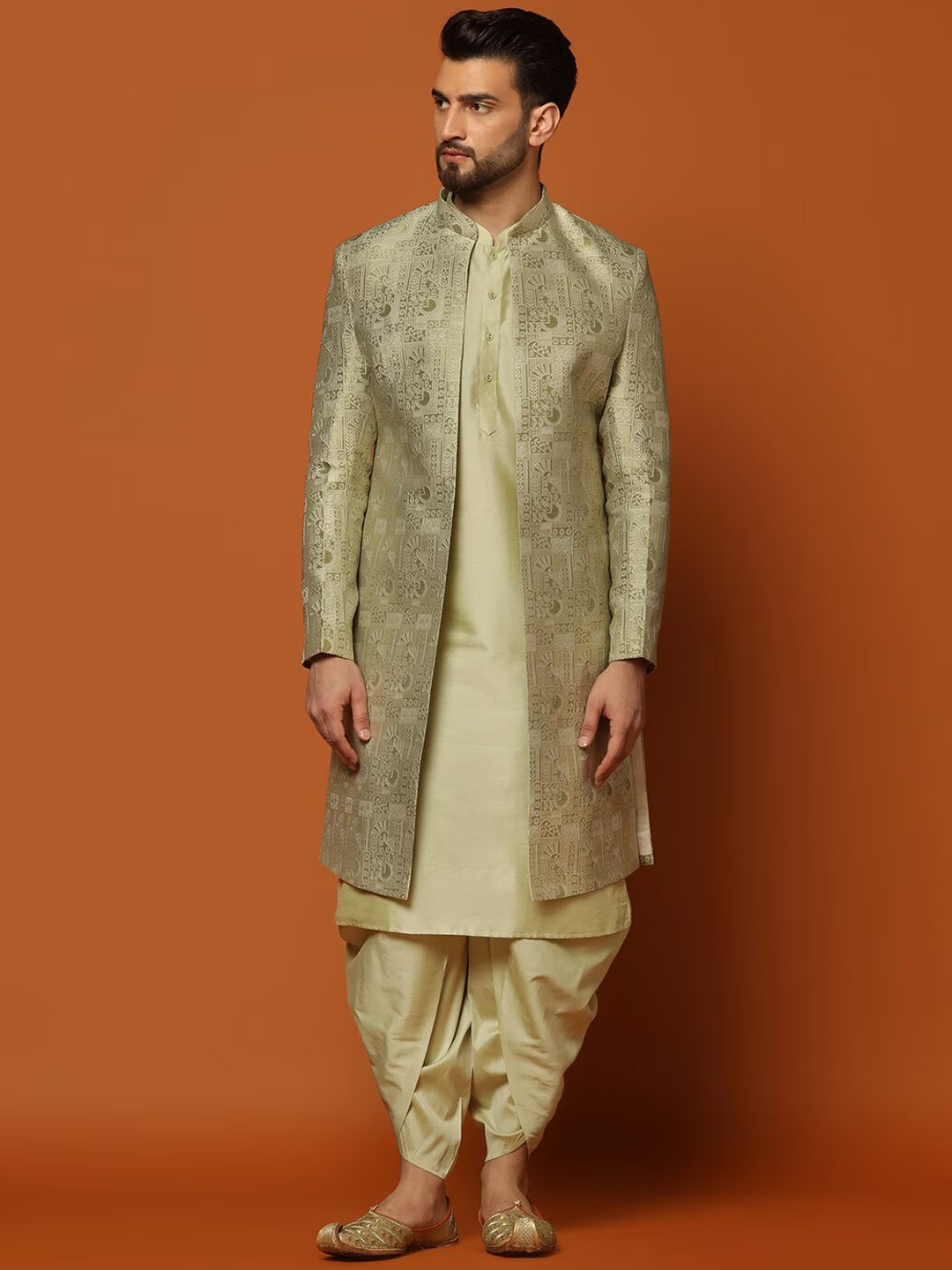 - Sea green colored woven design sherwani, has a mandarin collar, stylised front with button closures and long sleeves