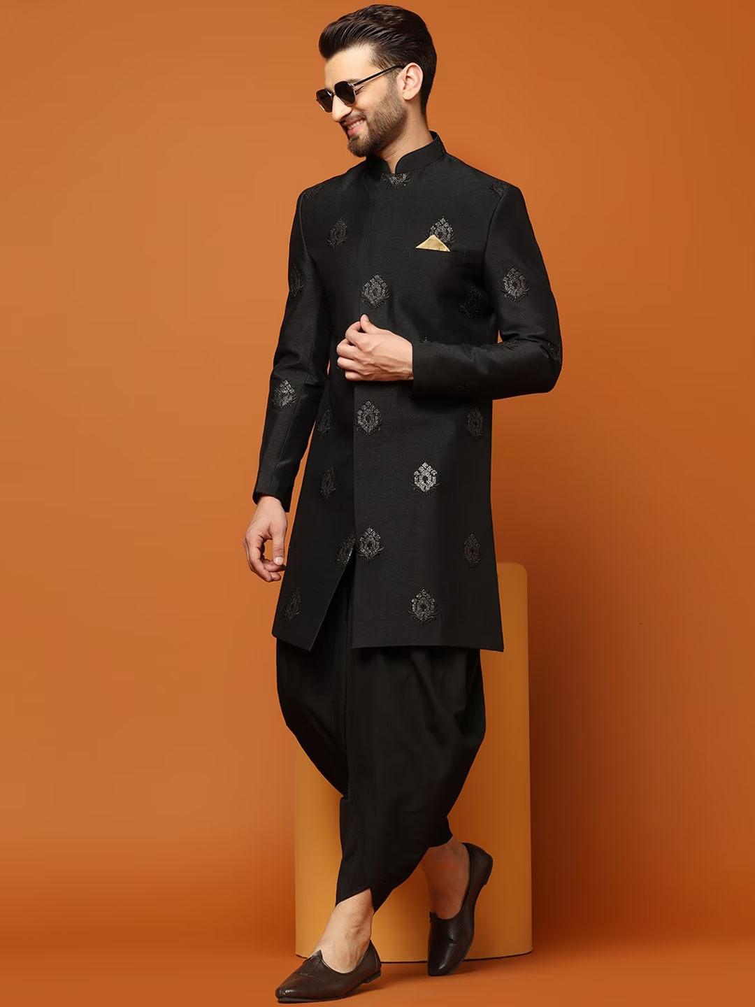 - Beige self-design sherwani, has a mandarin collar, stylised front with button closures and long sleeves
