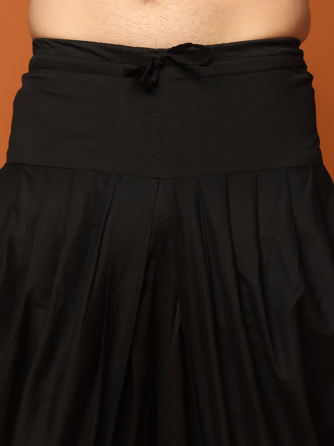 - Black solid dhoti pant, has an elasticated waistband with drawstring closure