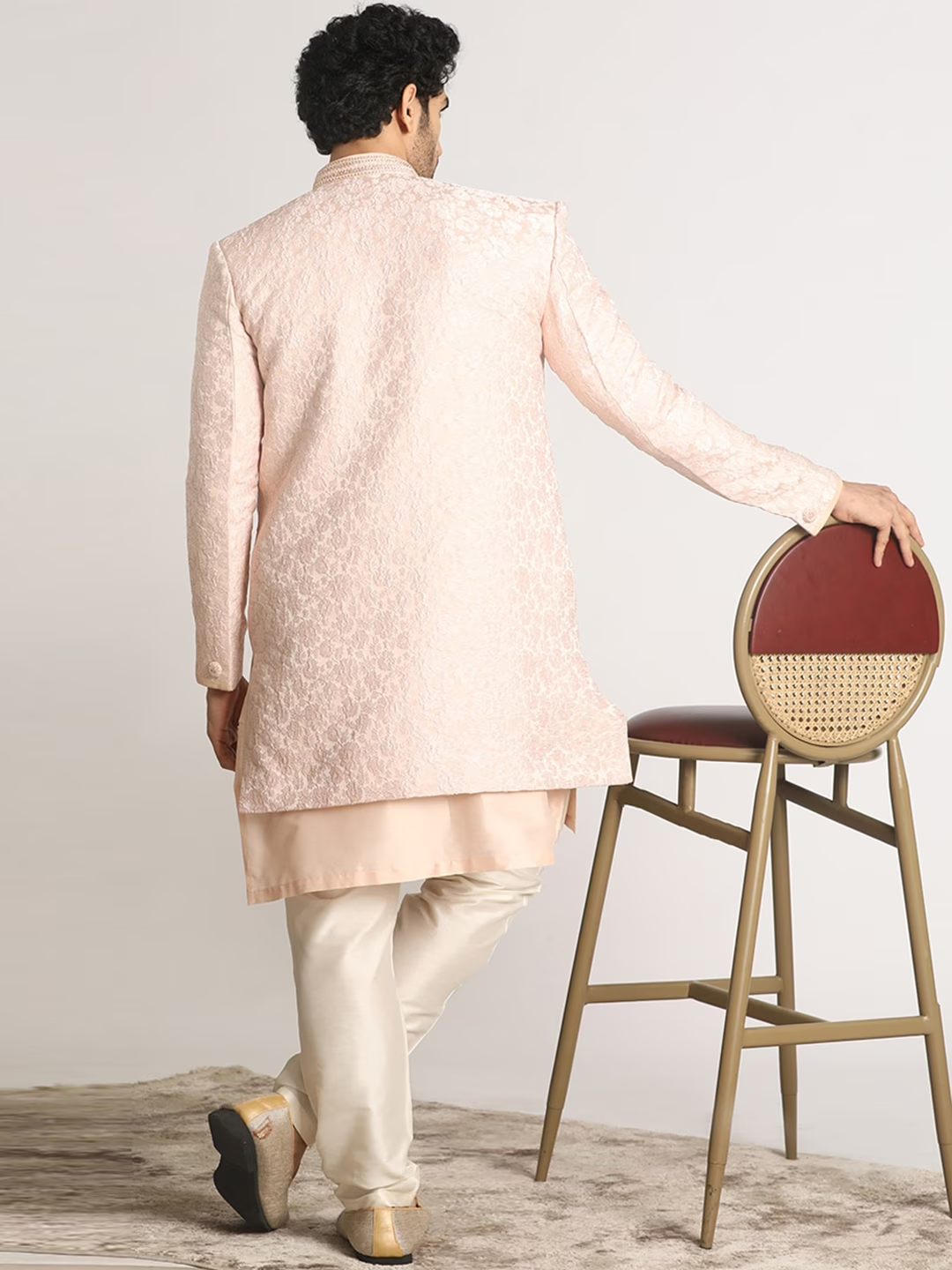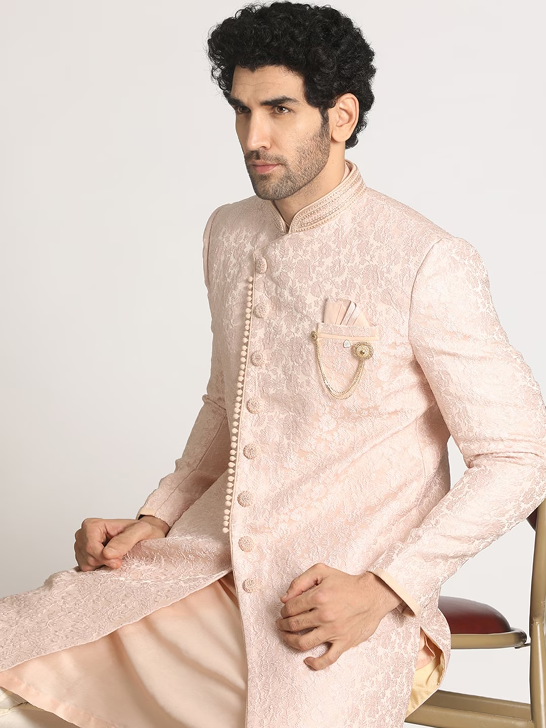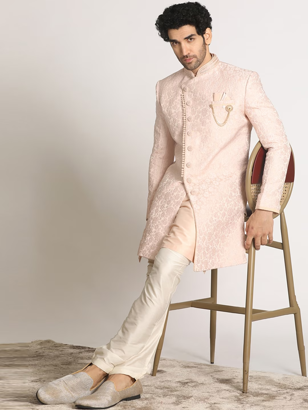 - Pink self-design sherwani, has a mandarin collar, stylised front with button closures and long sleeves