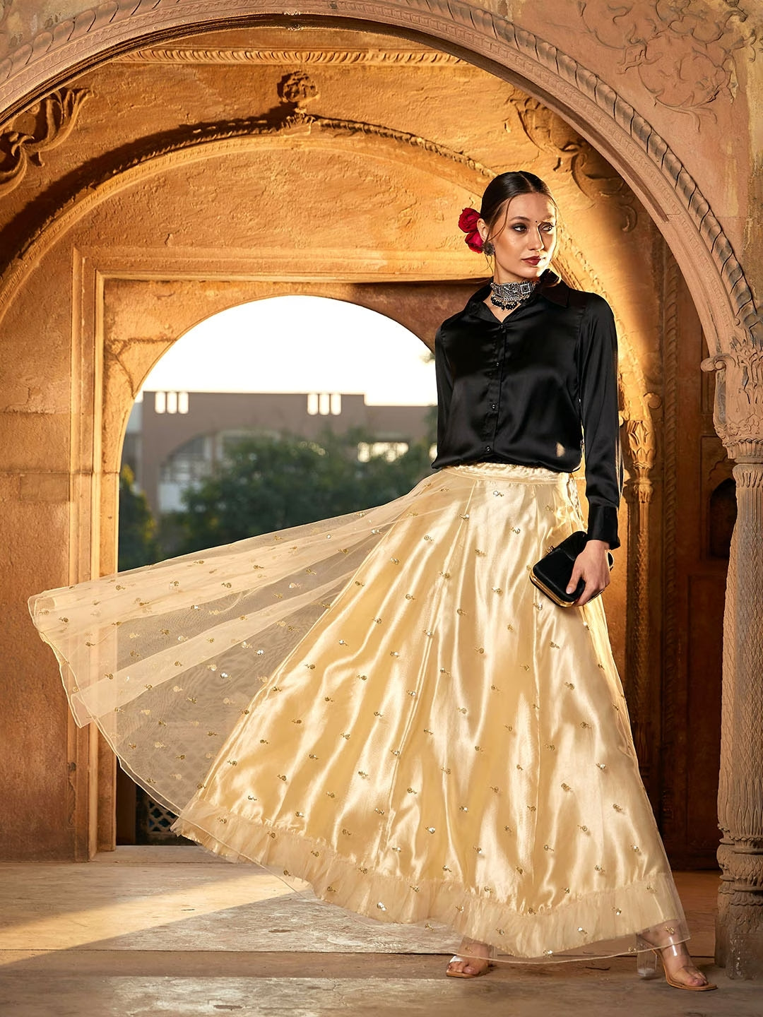 - Black and yellow embellished ready to wear lehenga, has drawstring closure, flared hem