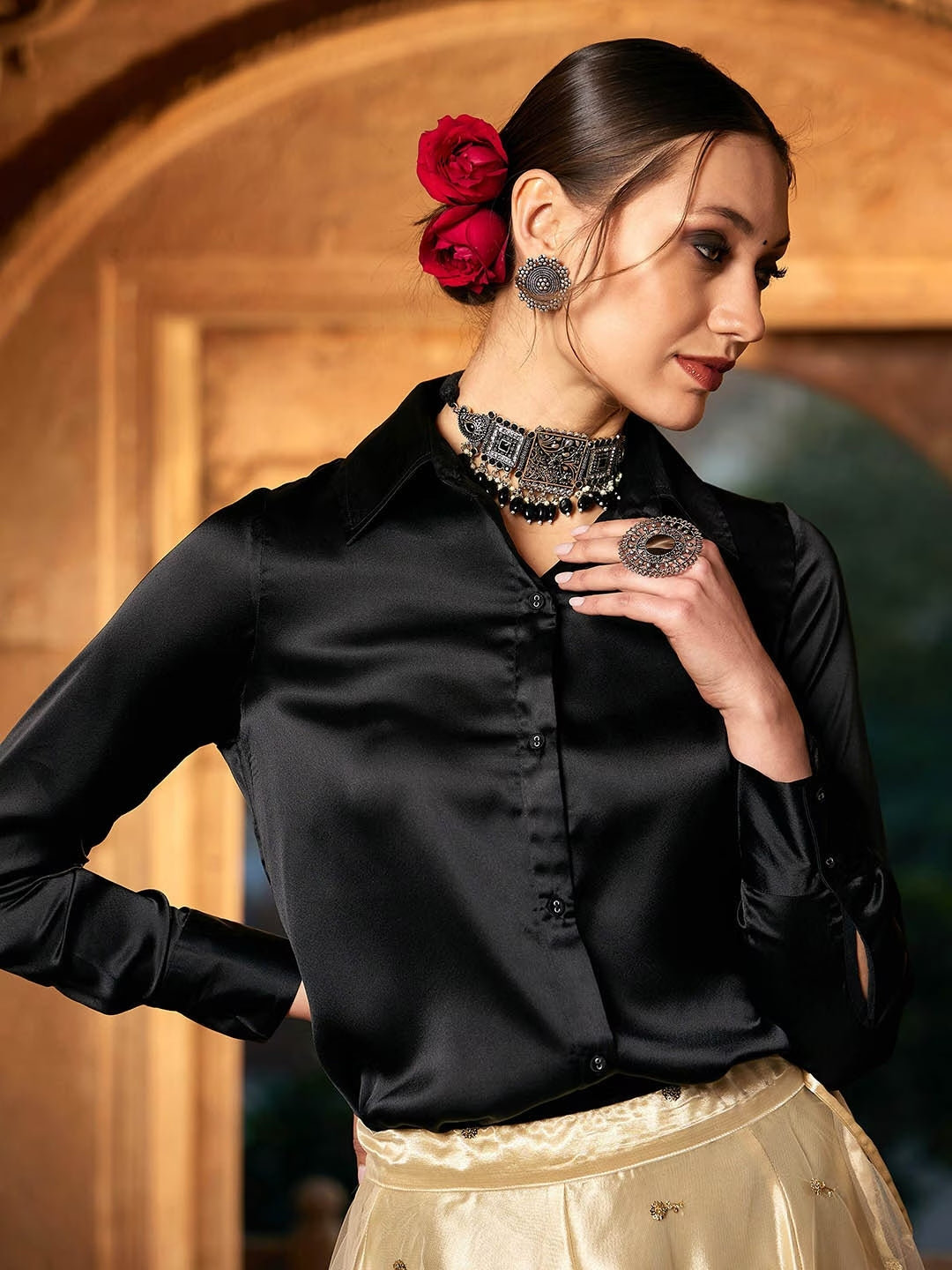 - Black and yellow solid ready to wear blouse, has a v-neck, long sleeves, zip closure