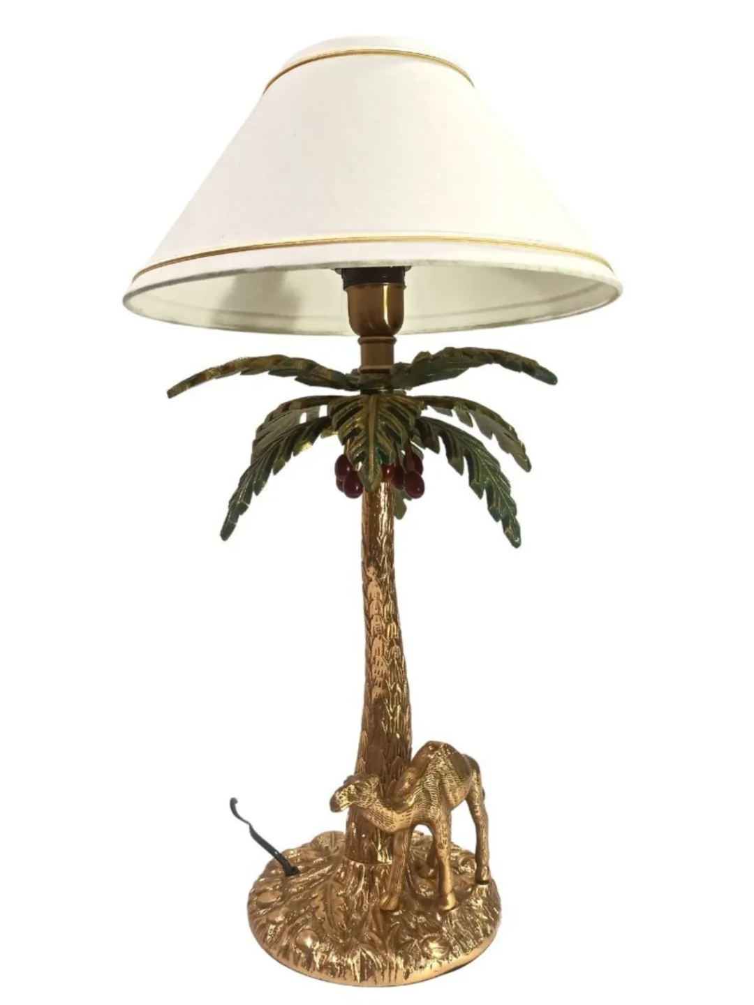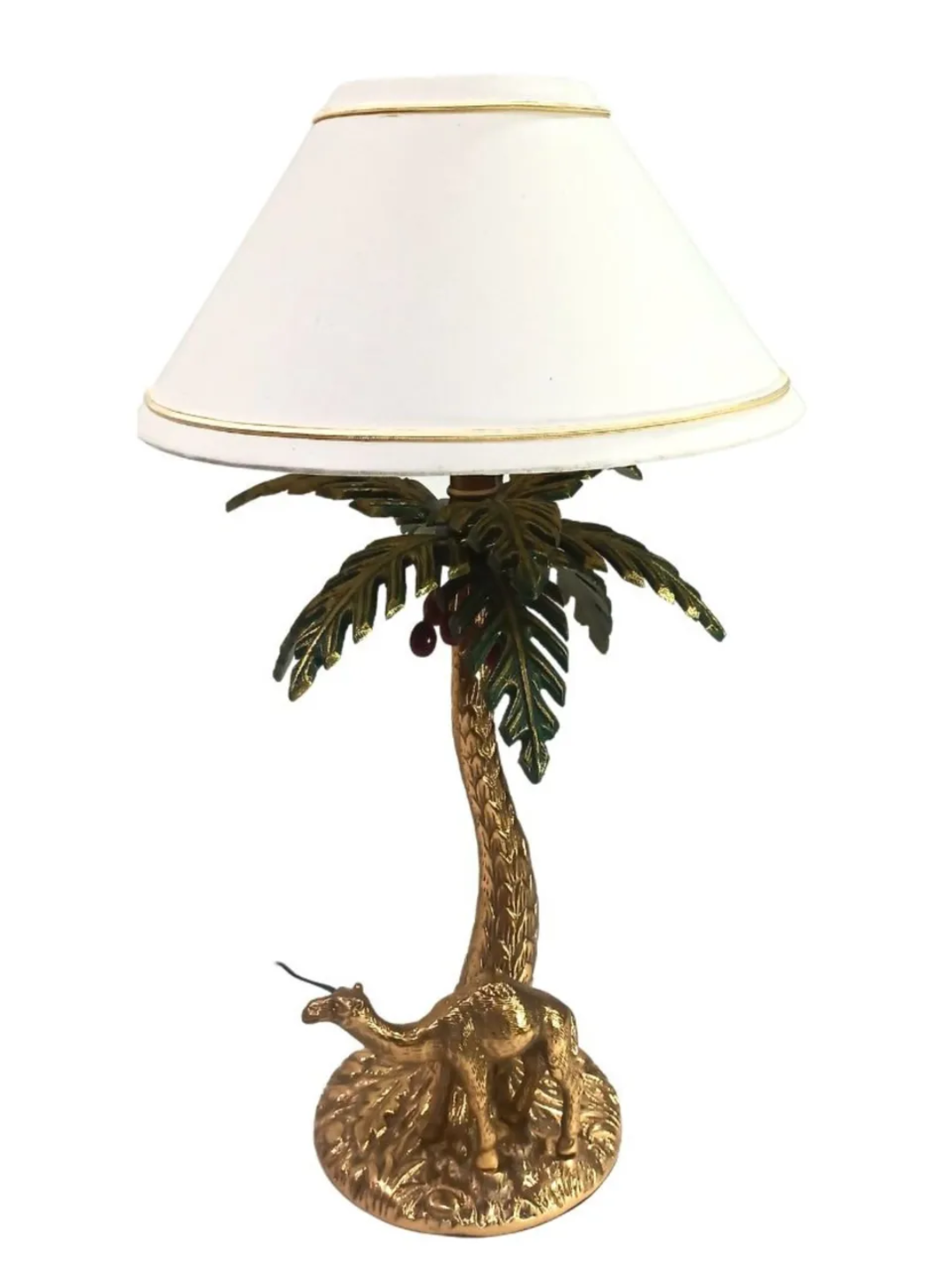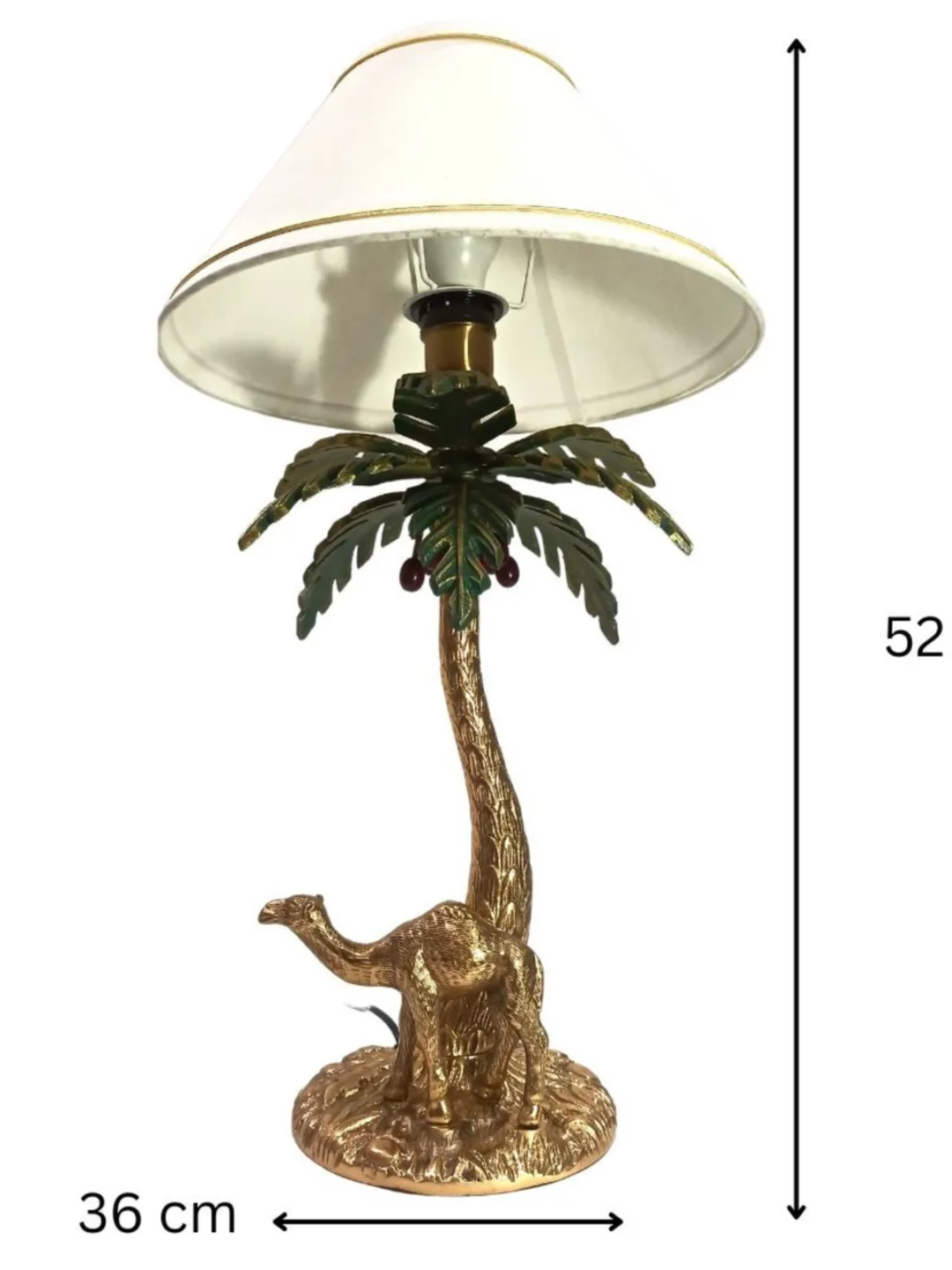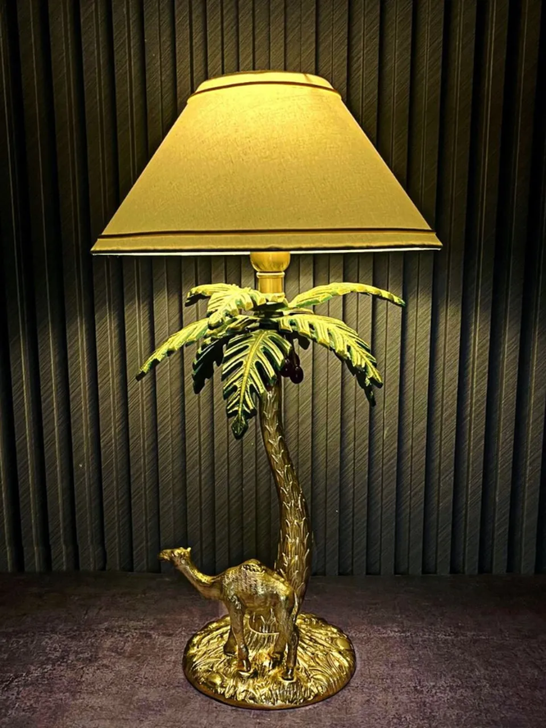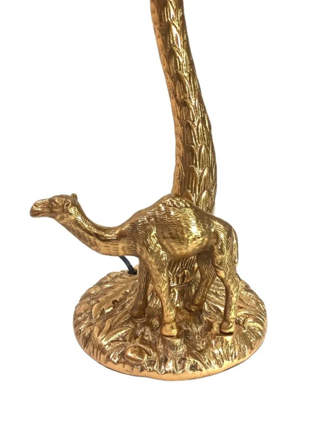 A tropical oasis feel to your home with these metal lamps that feature palm trees and camels.Resting Camel on Ornate Oval Base under a Palm Tree Designed in a vintage style, the bronze finish of this bedside lamp is perfectly paired with the white gold bell shape lampshade to create a timeless look. The traditional design is modernised with a rustic feel, making this the perfect finishing touch to any style of décor