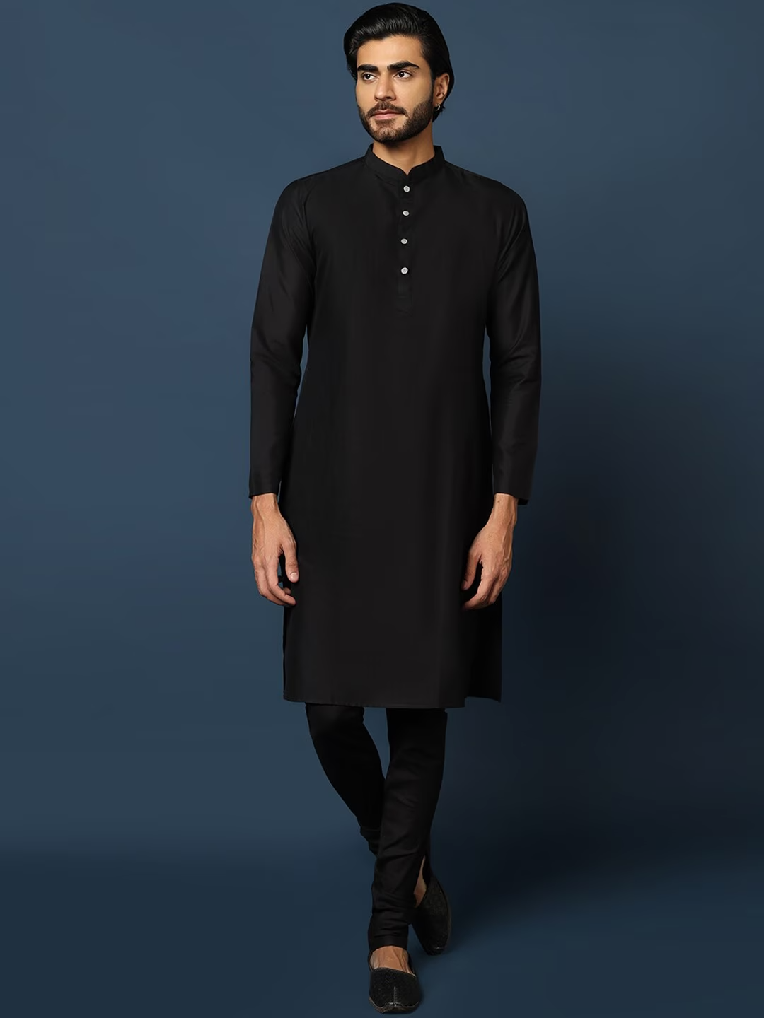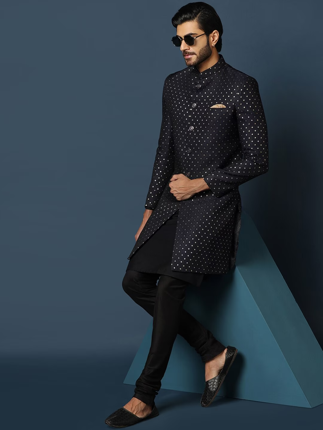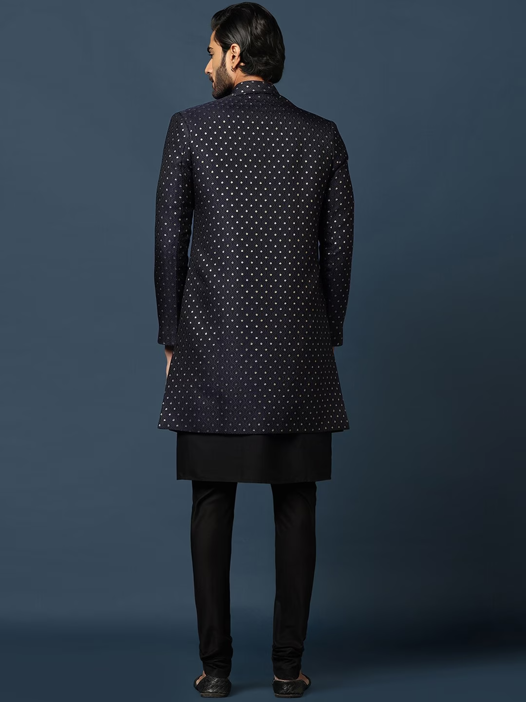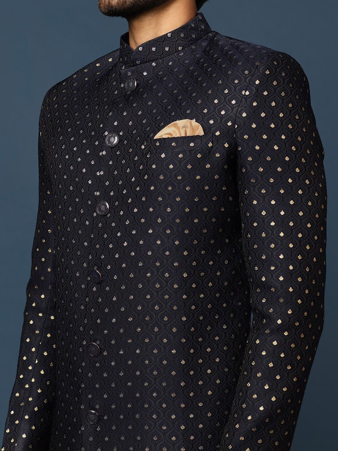 - Navy-blue woven design sherwani, has a mandarin collar, stylised front with button closures and long sleeves