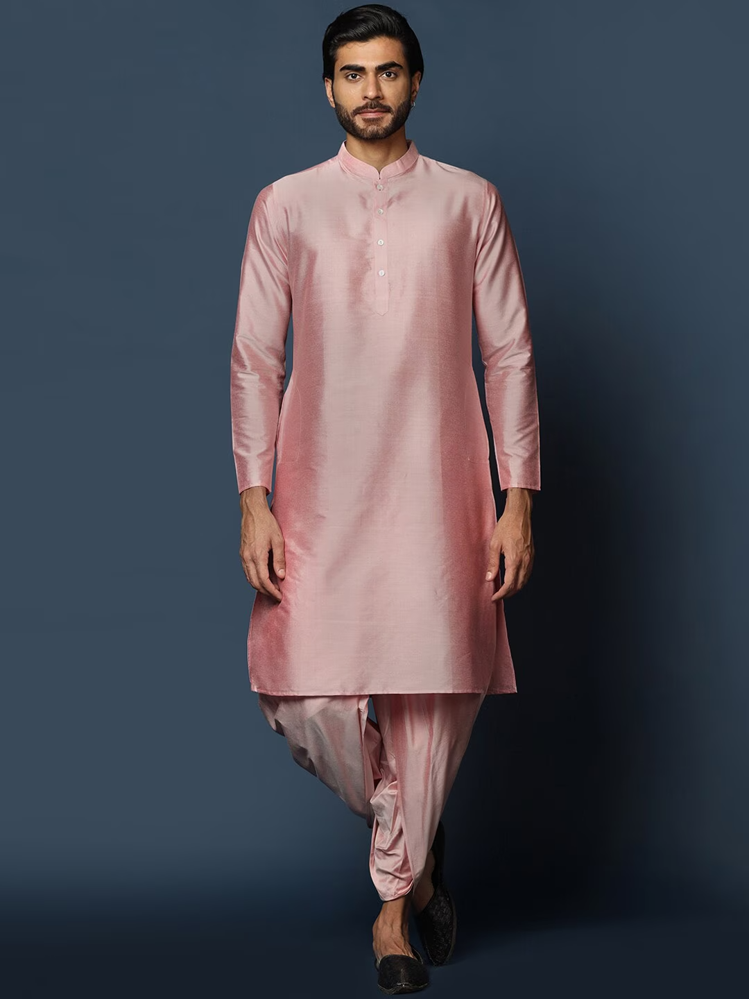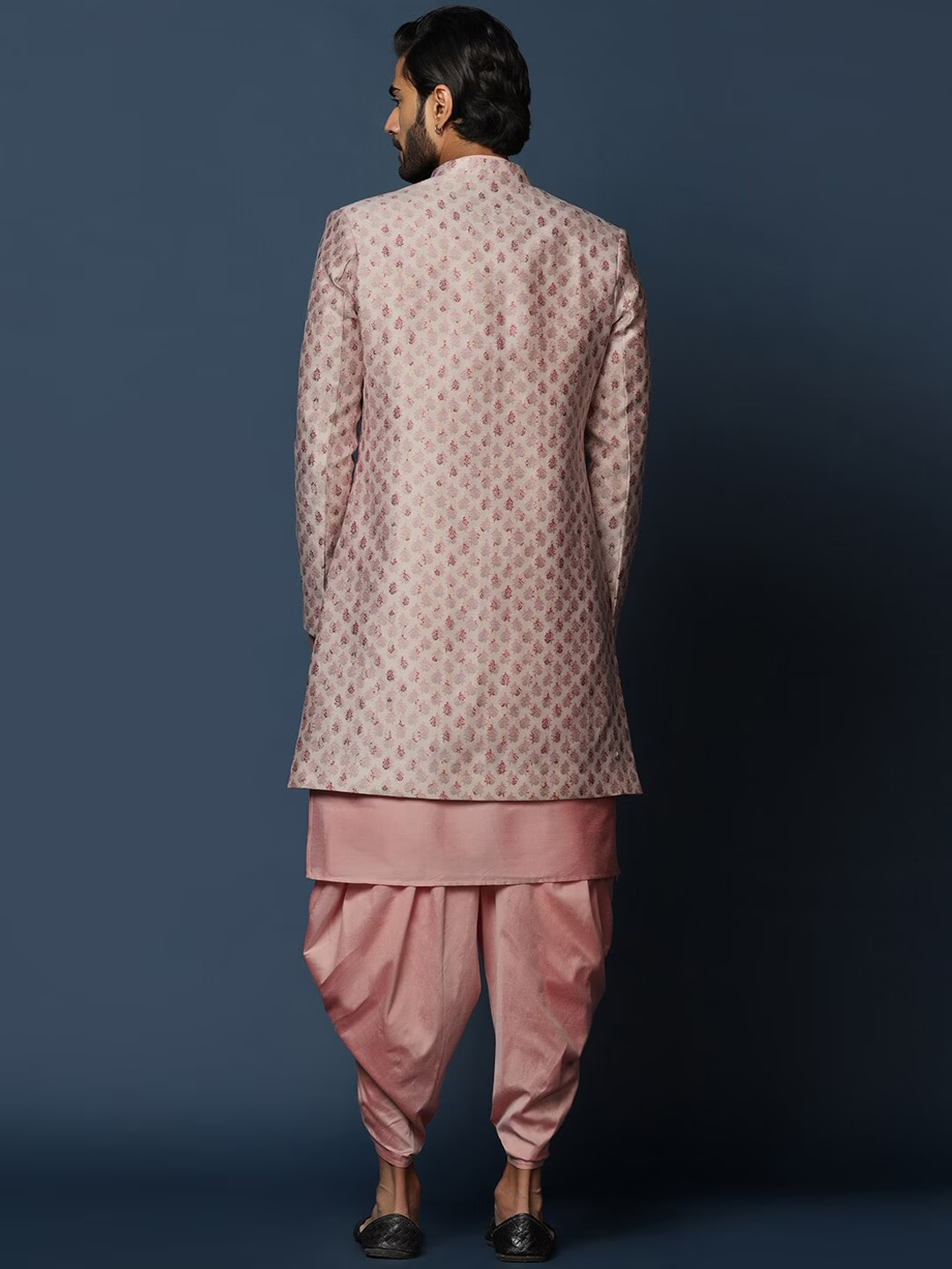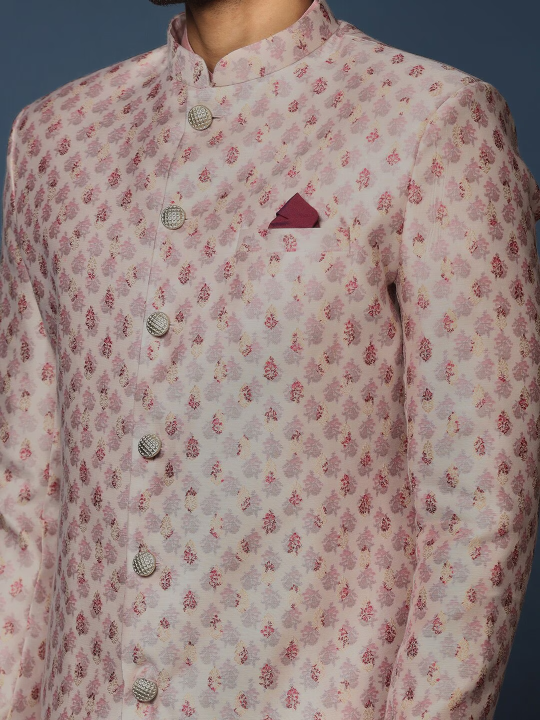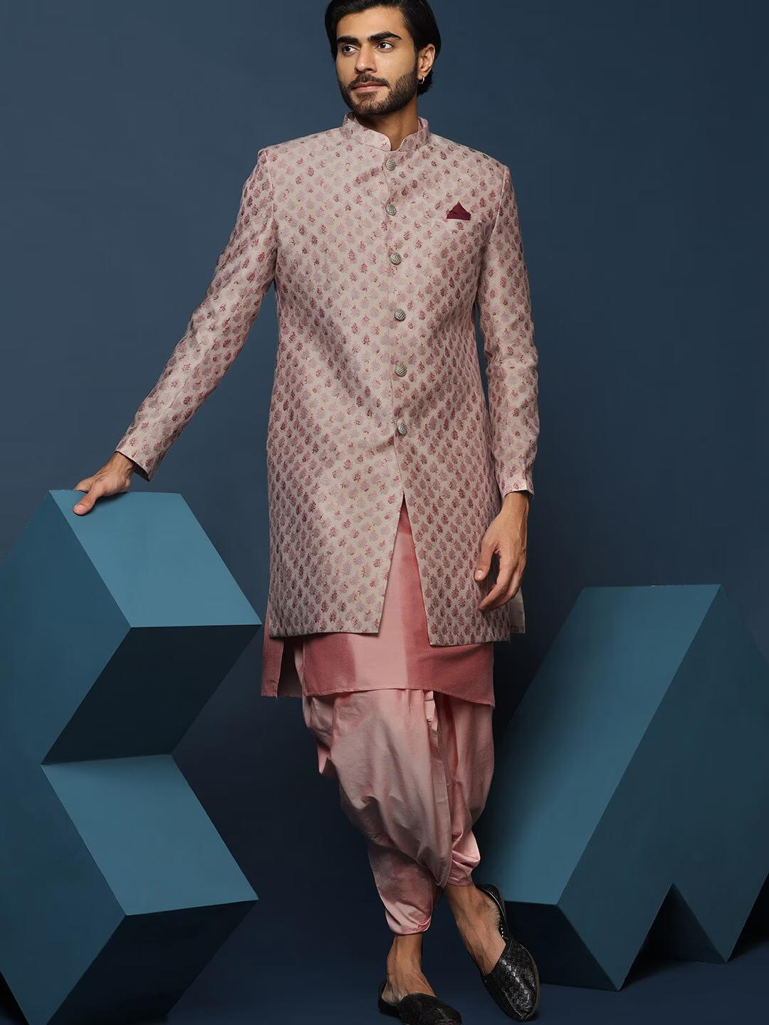 - Pink woven-design sherwani, has a mandarin collar, stylised front with button closures and long sleeves