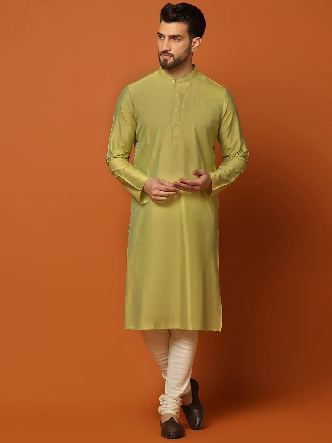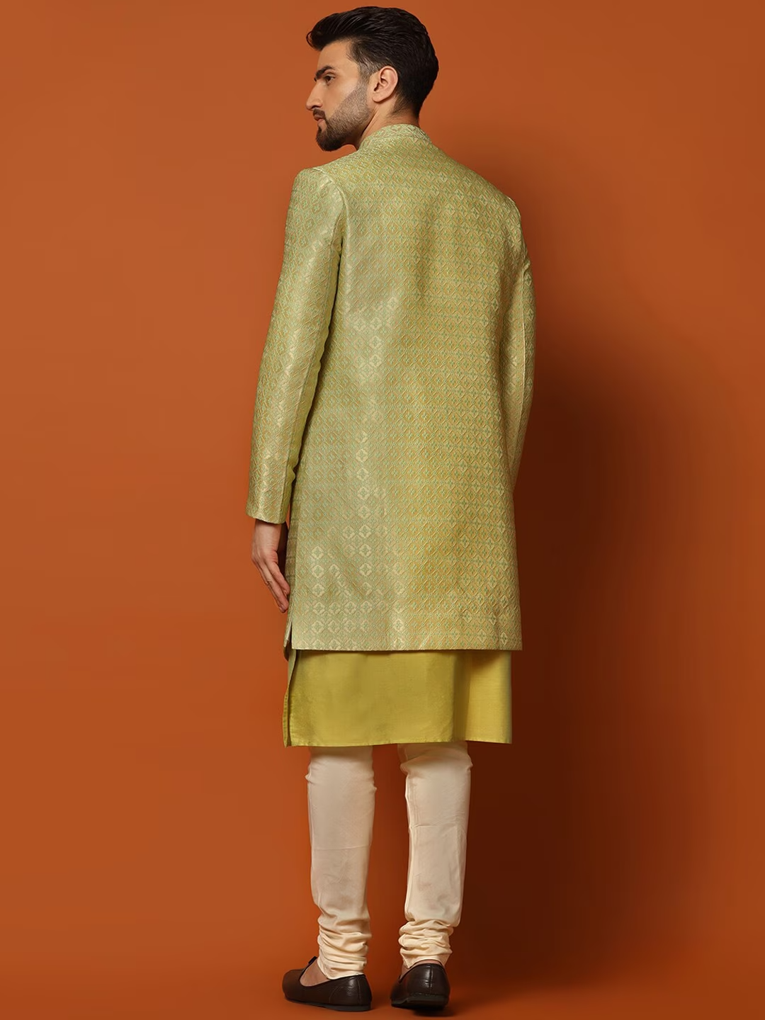 - Green colored woven design sherwani, has a mandarin collar, stylised front with button closures and long sleeves
