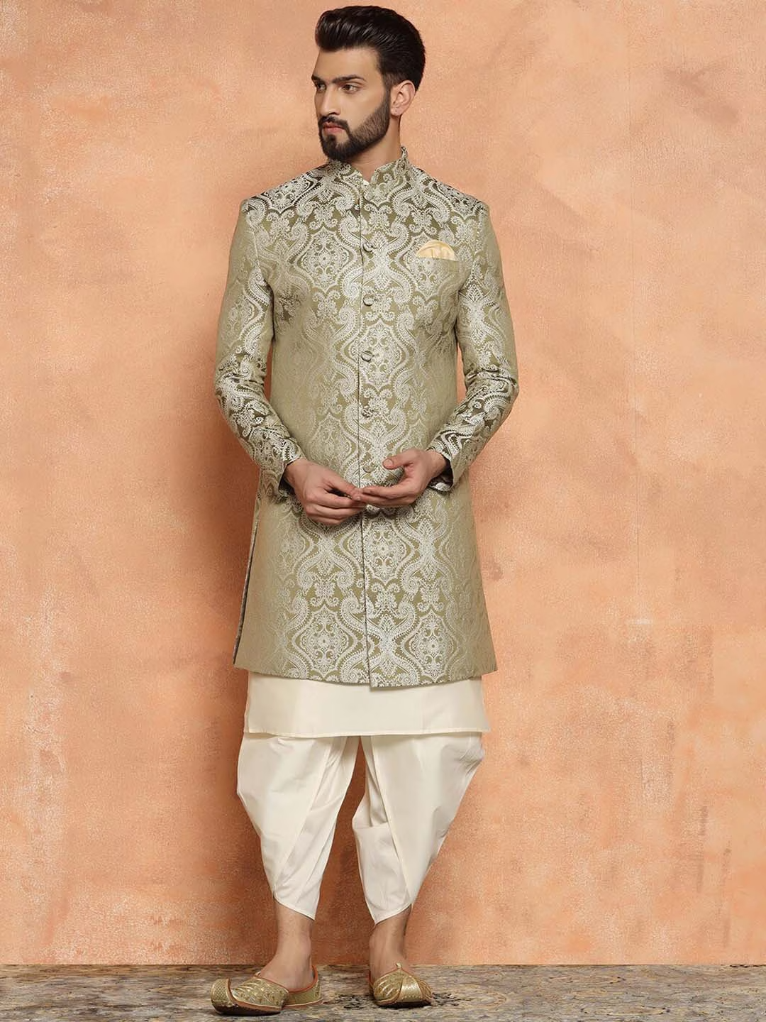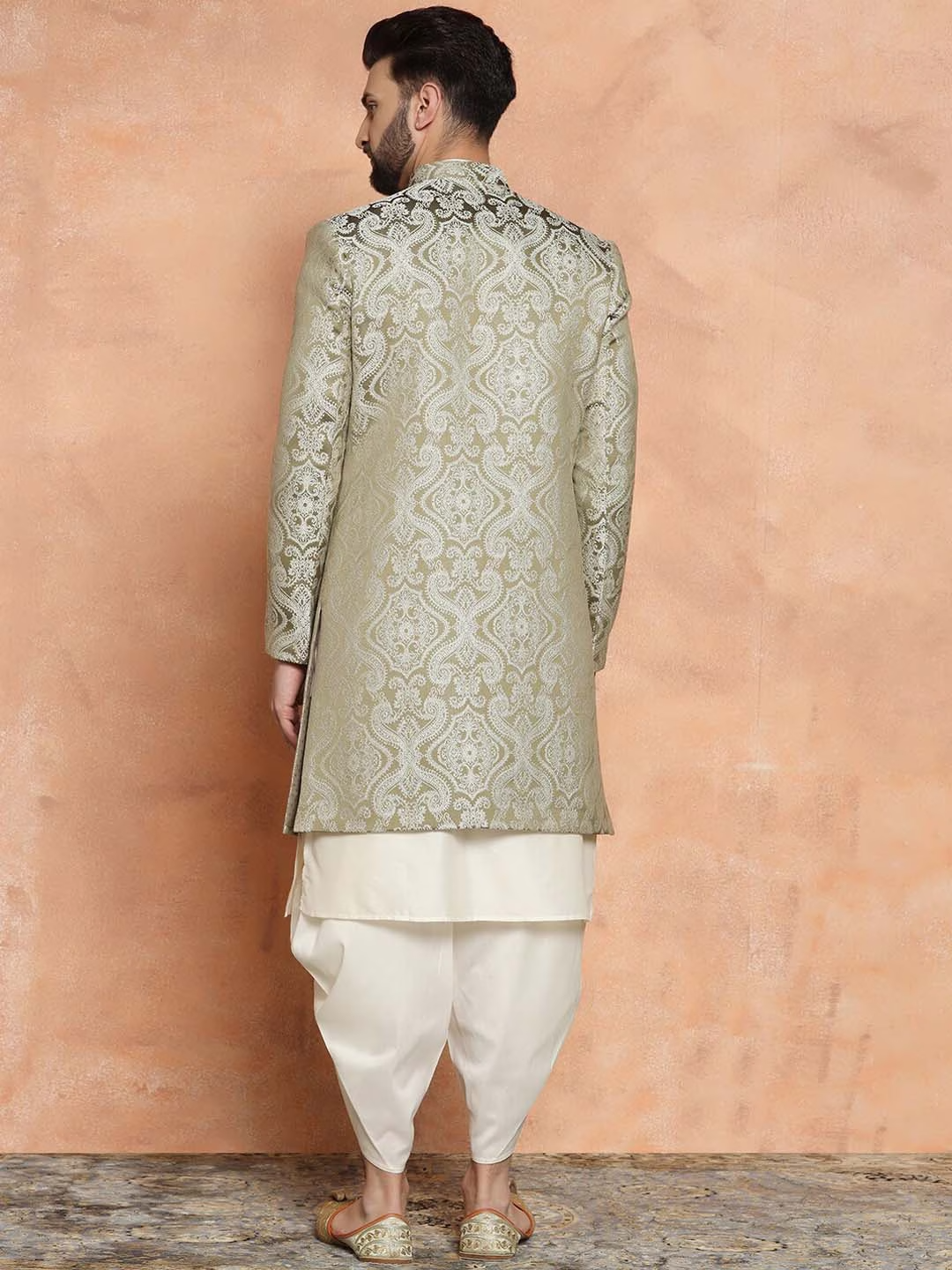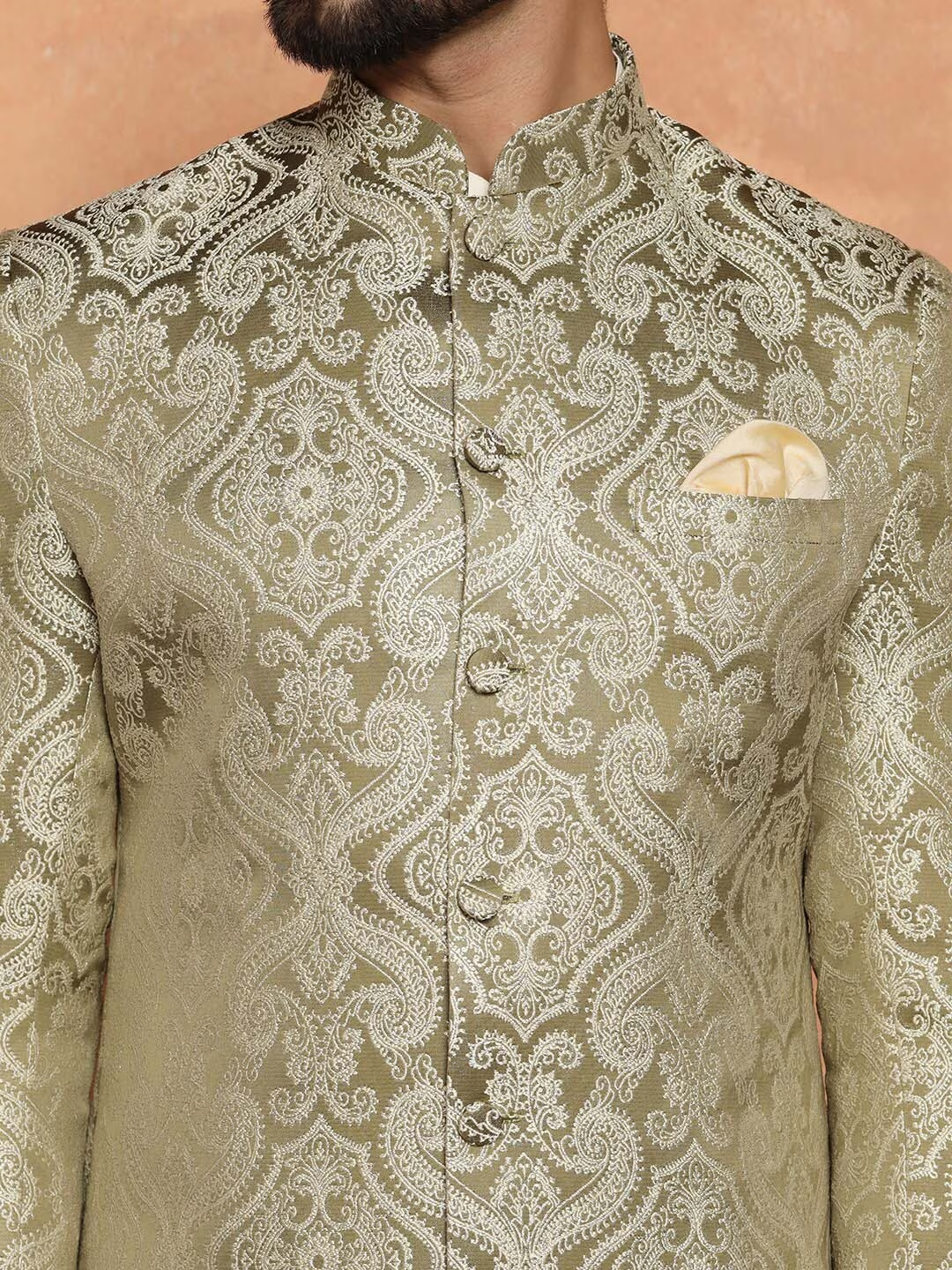 - Olive green woven design sherwani, has a mandarin collar, stylised front with button closures and long sleeves